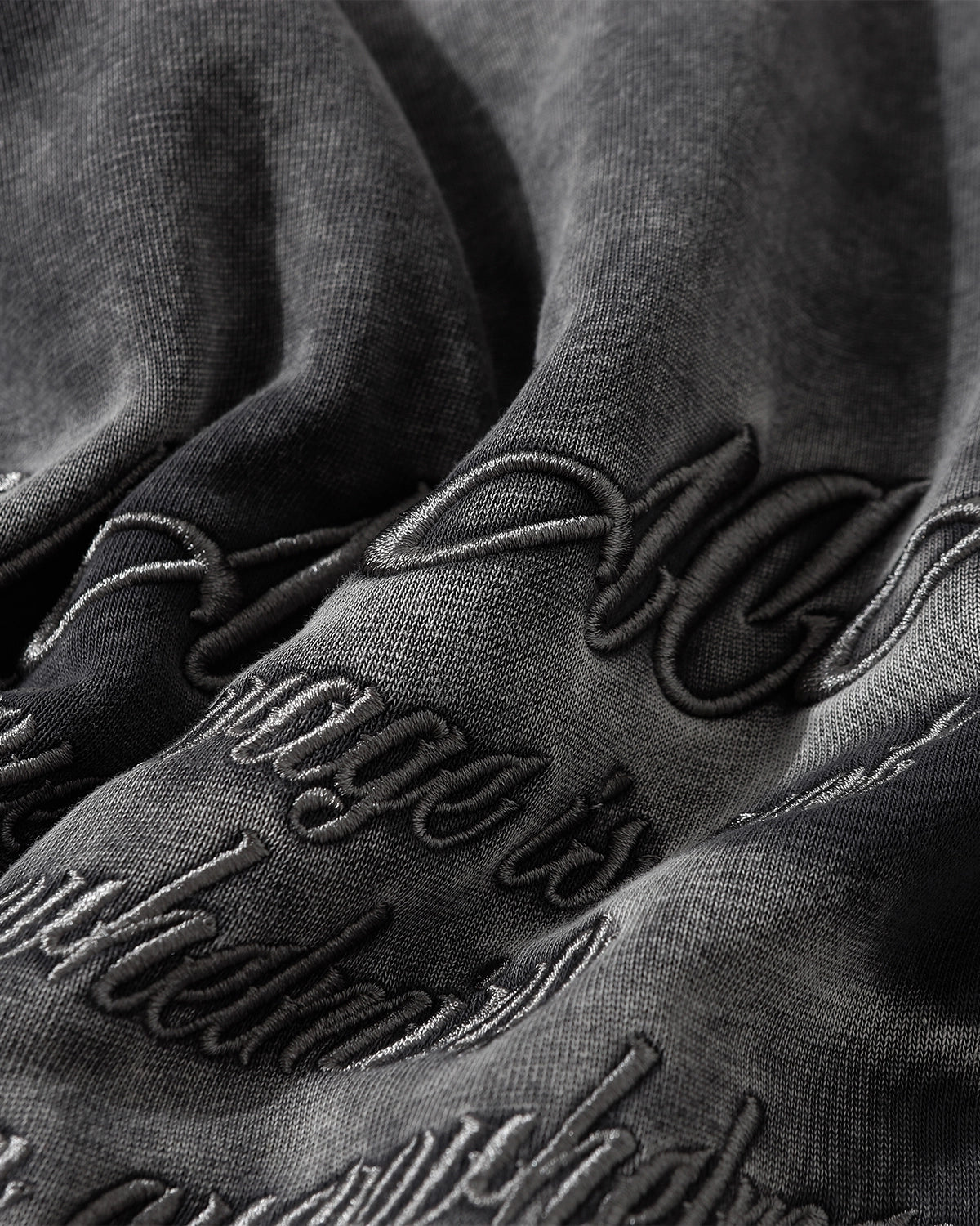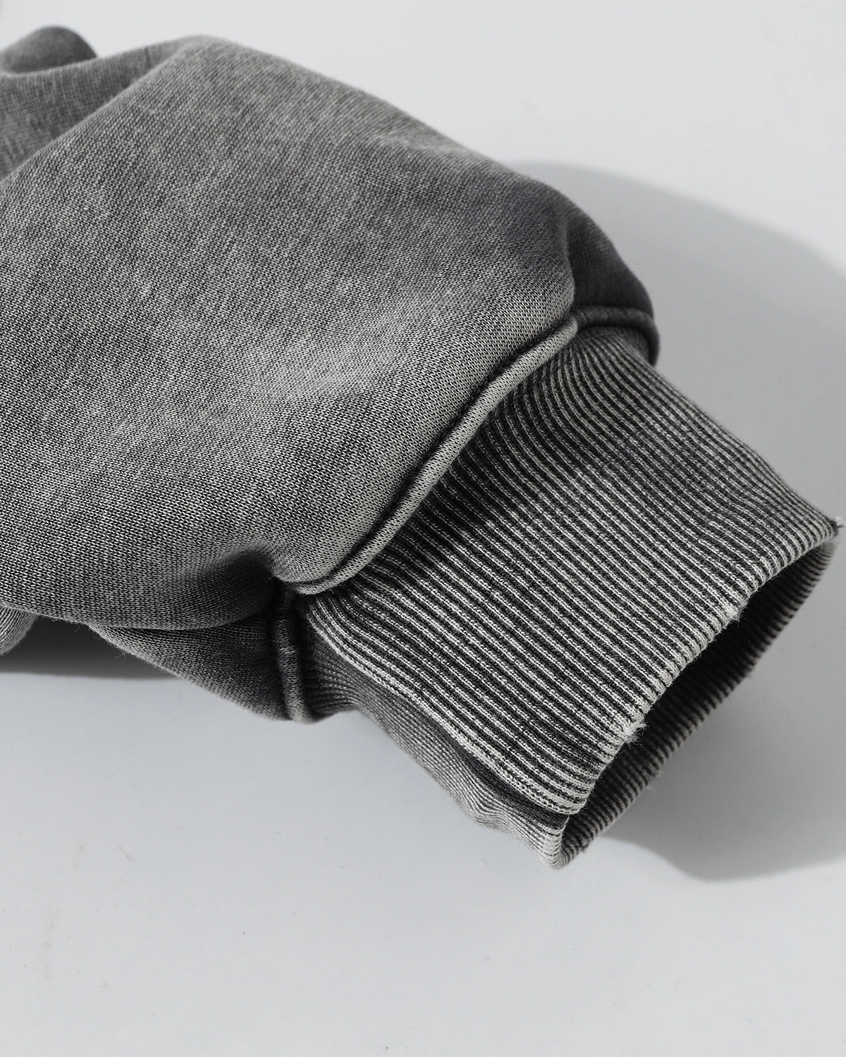 The drawstring sleeves add an innovative touch, creating a gathered effect that enhances the oversized cropped silhouette, offering a tailored street-ready vibe. The washed black finish and faded white accents accentuate the streetwear aesthetic, while the raglan sleeve design ensures comfort and freedom of movement.