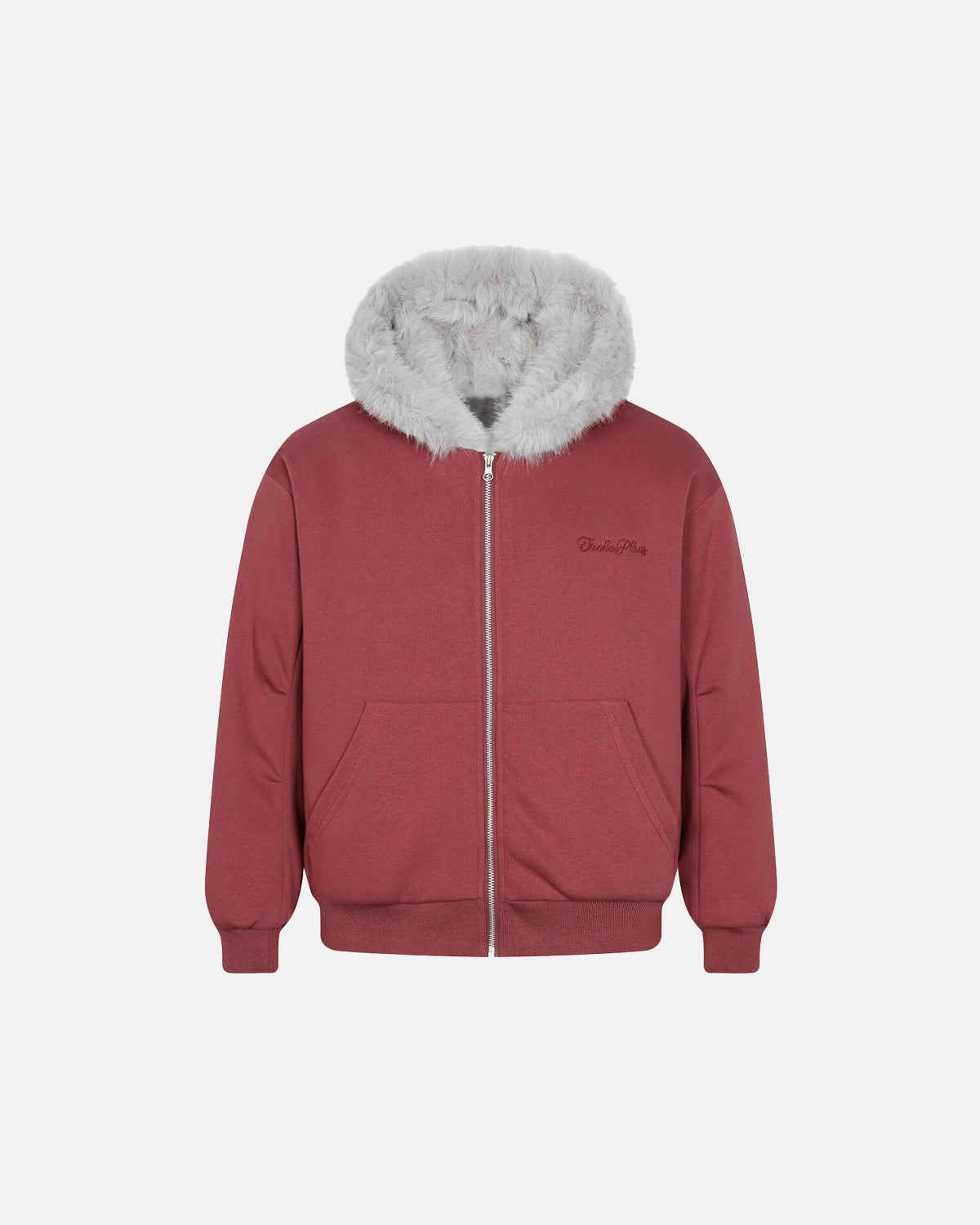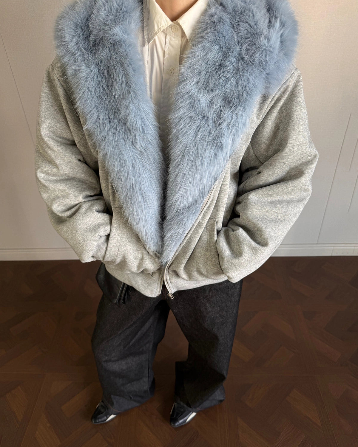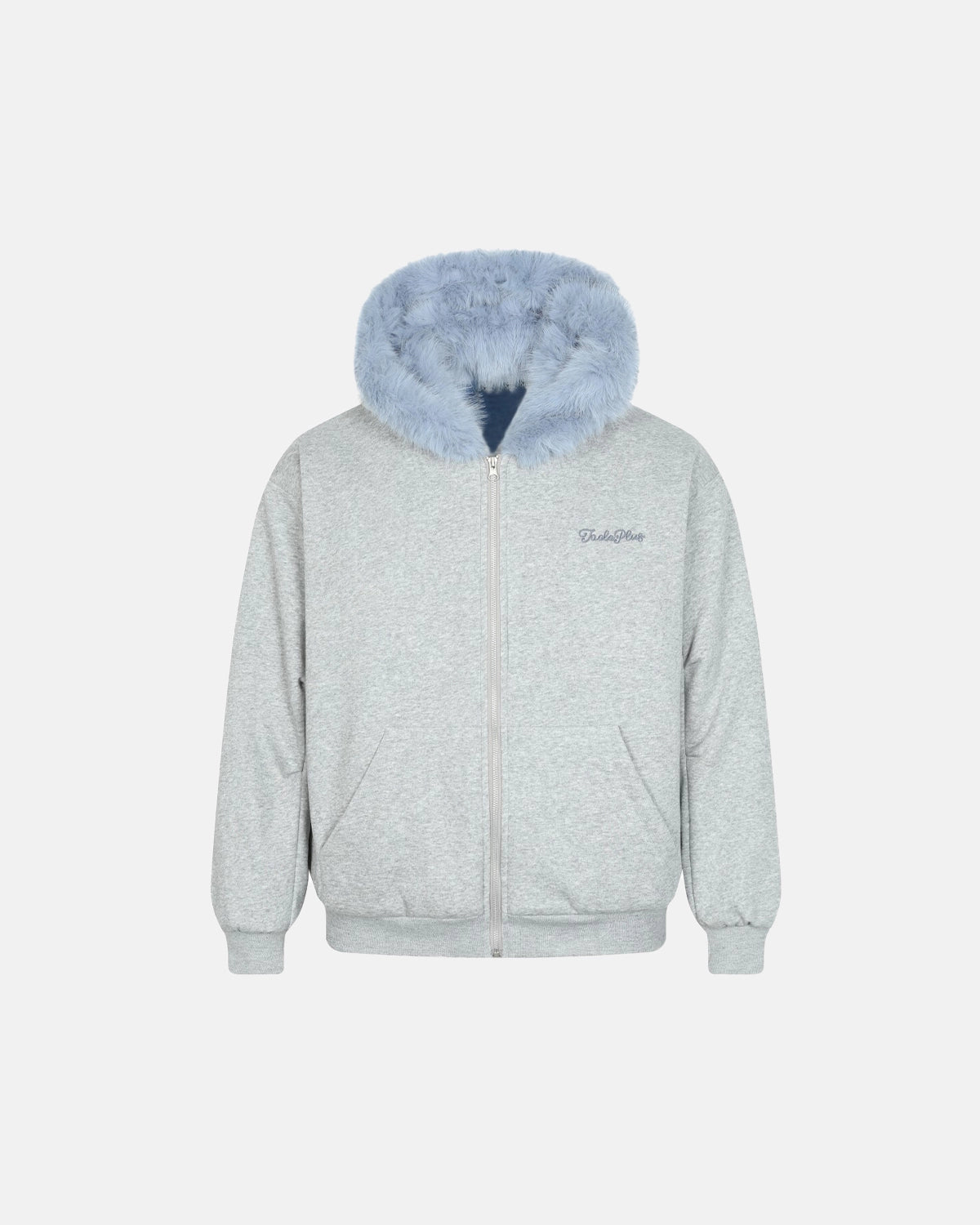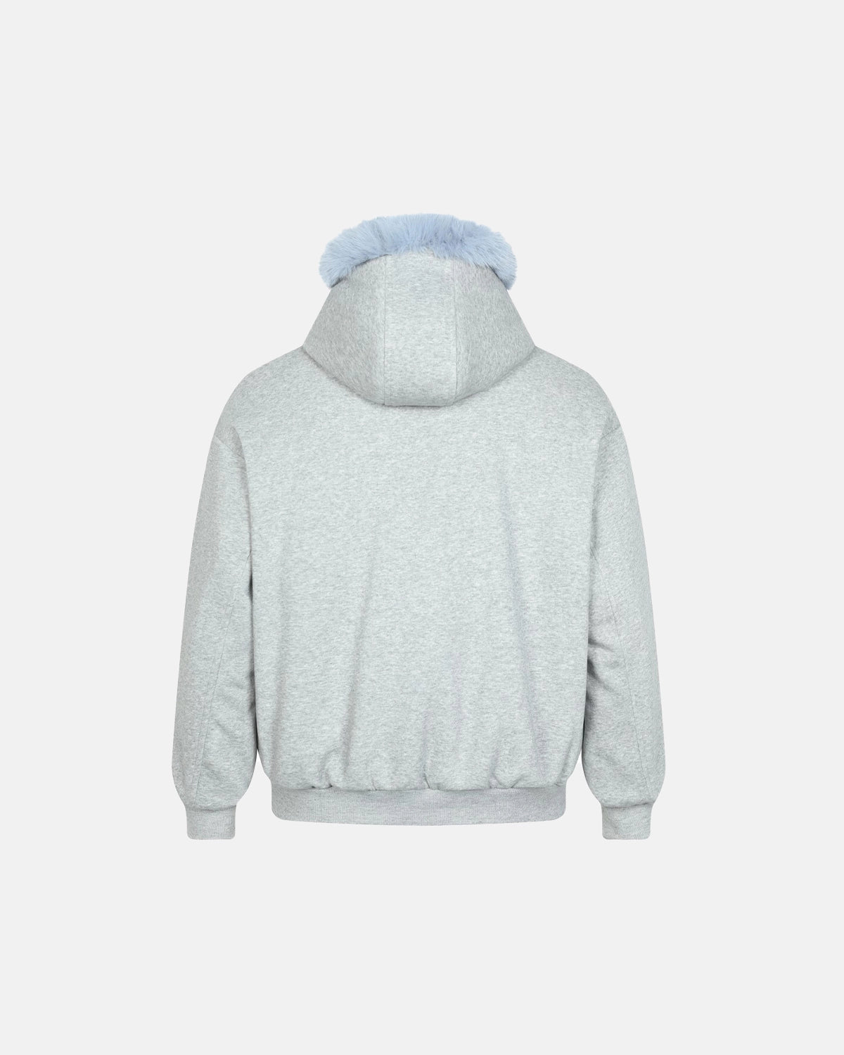 This Baby Blue Faux Fur Jacket features a soft gray cotton fabric with a luxurious baby blue faux fur lining in the hood for extra warmth and texture.