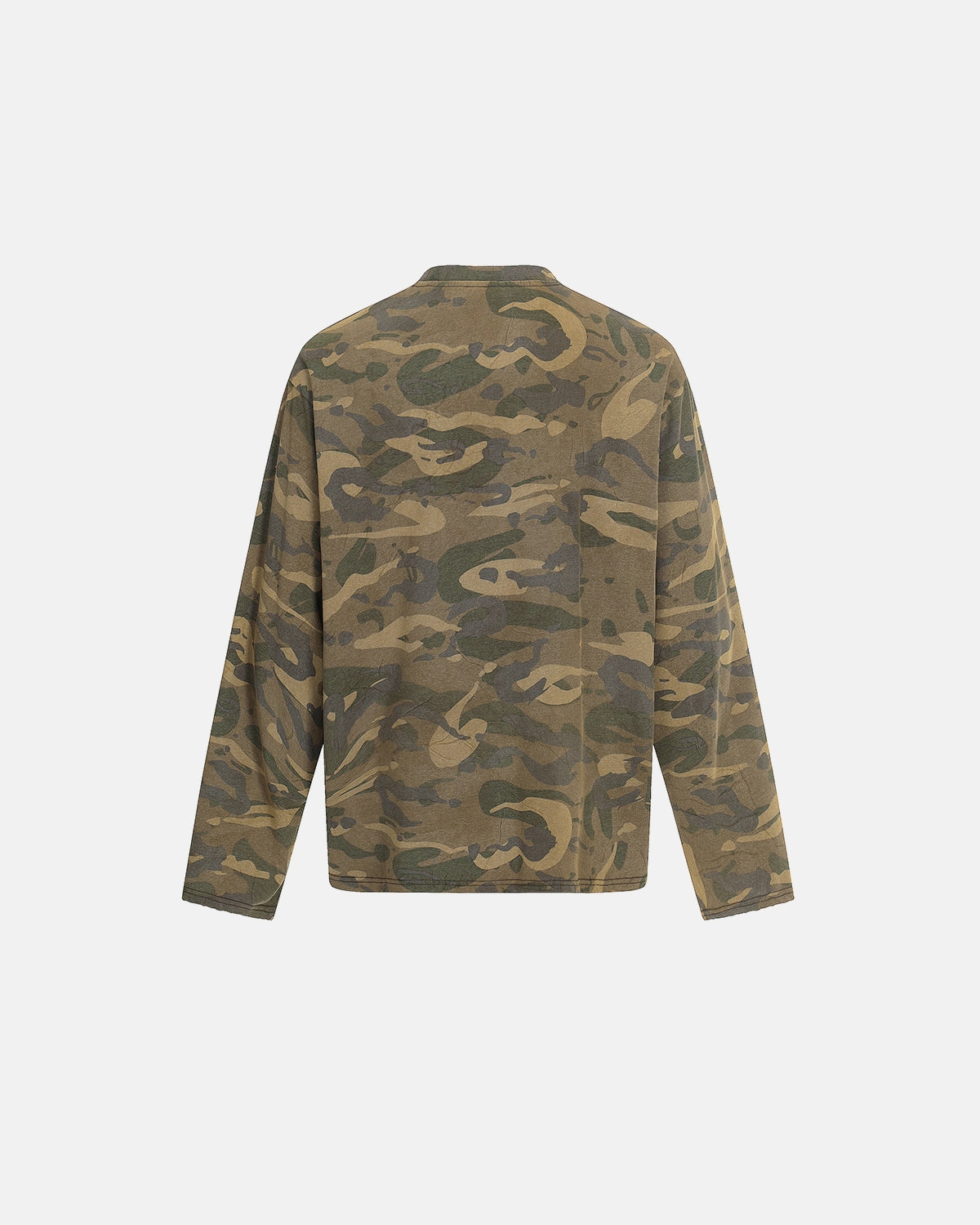 This distressed camo long sleeve T-shirt features a vintage camouflage pattern with intentional fading and subtle distressed details for a worn-in look. Designed with a relaxed streetwear fit, it offers all-day comfort while delivering a rugged, military-inspired street style. Ideal for layering or wearing solo, this camo long sleeve tee adds bold, urban character to everyday streetwear outfits.