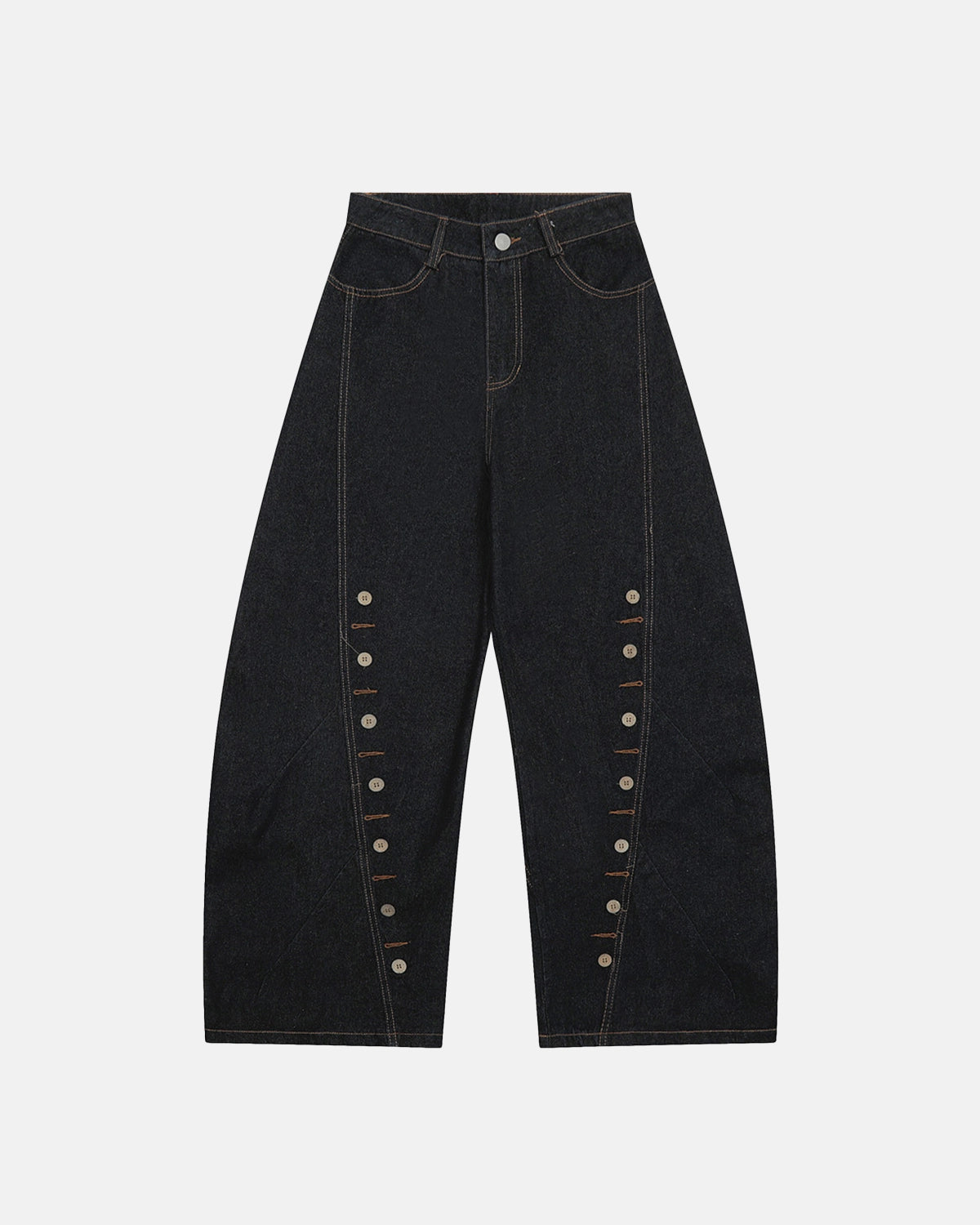 The INFLATION Button Detail Baggy Jeans blend bold streetwear aesthetics with classic denim construction. Featuring button decor along the sides, these baggy jeans bring a powerful high-street fashion vibe. The loose fit ensures ultimate comfort, while the unique design gives an edge to your everyday streetwear look.