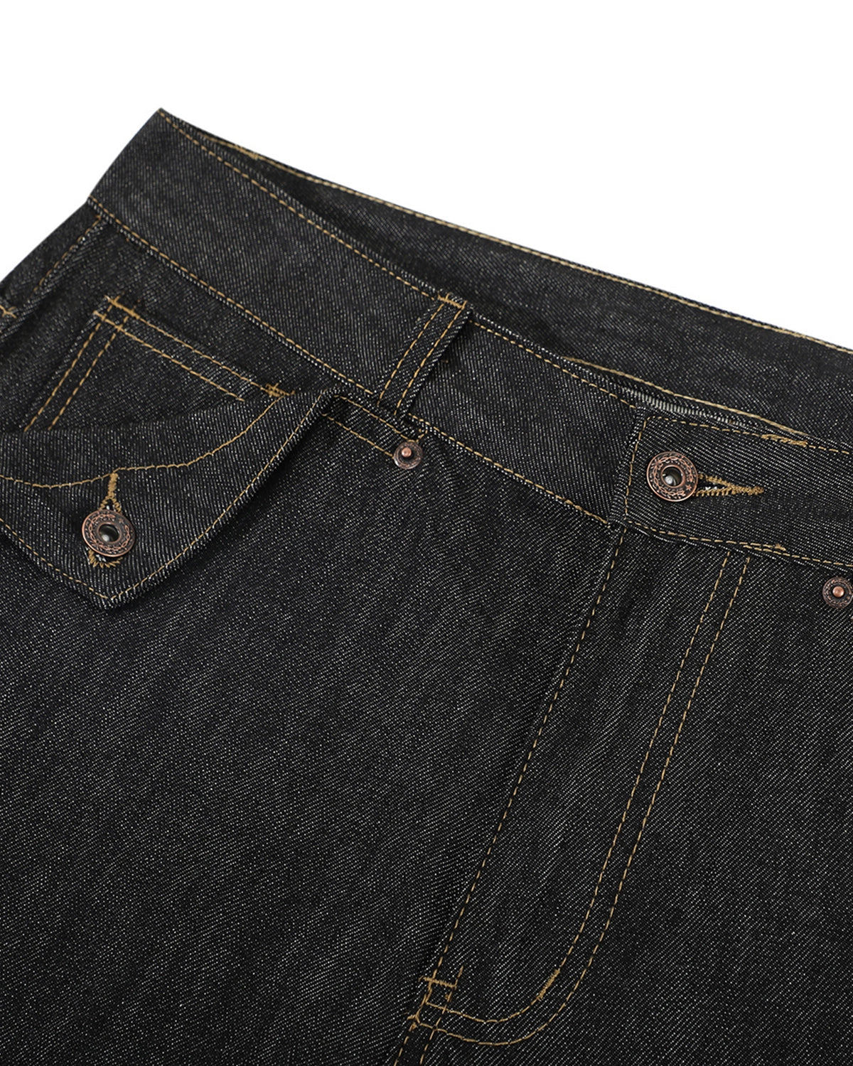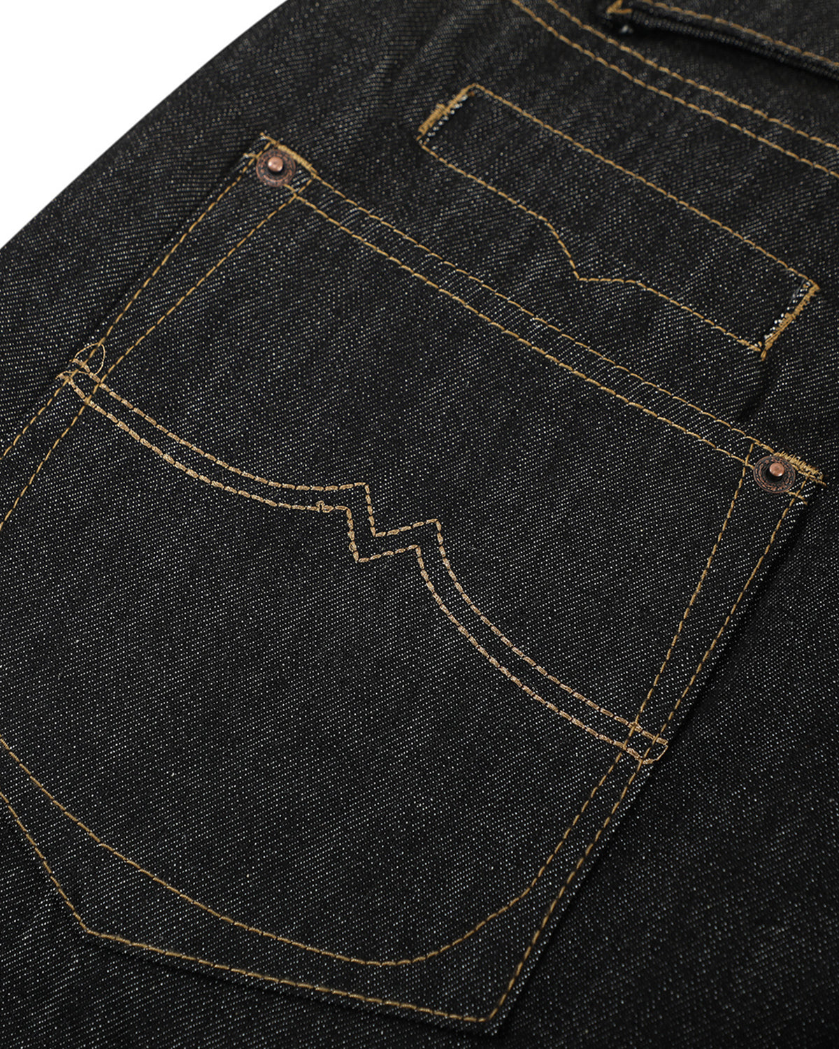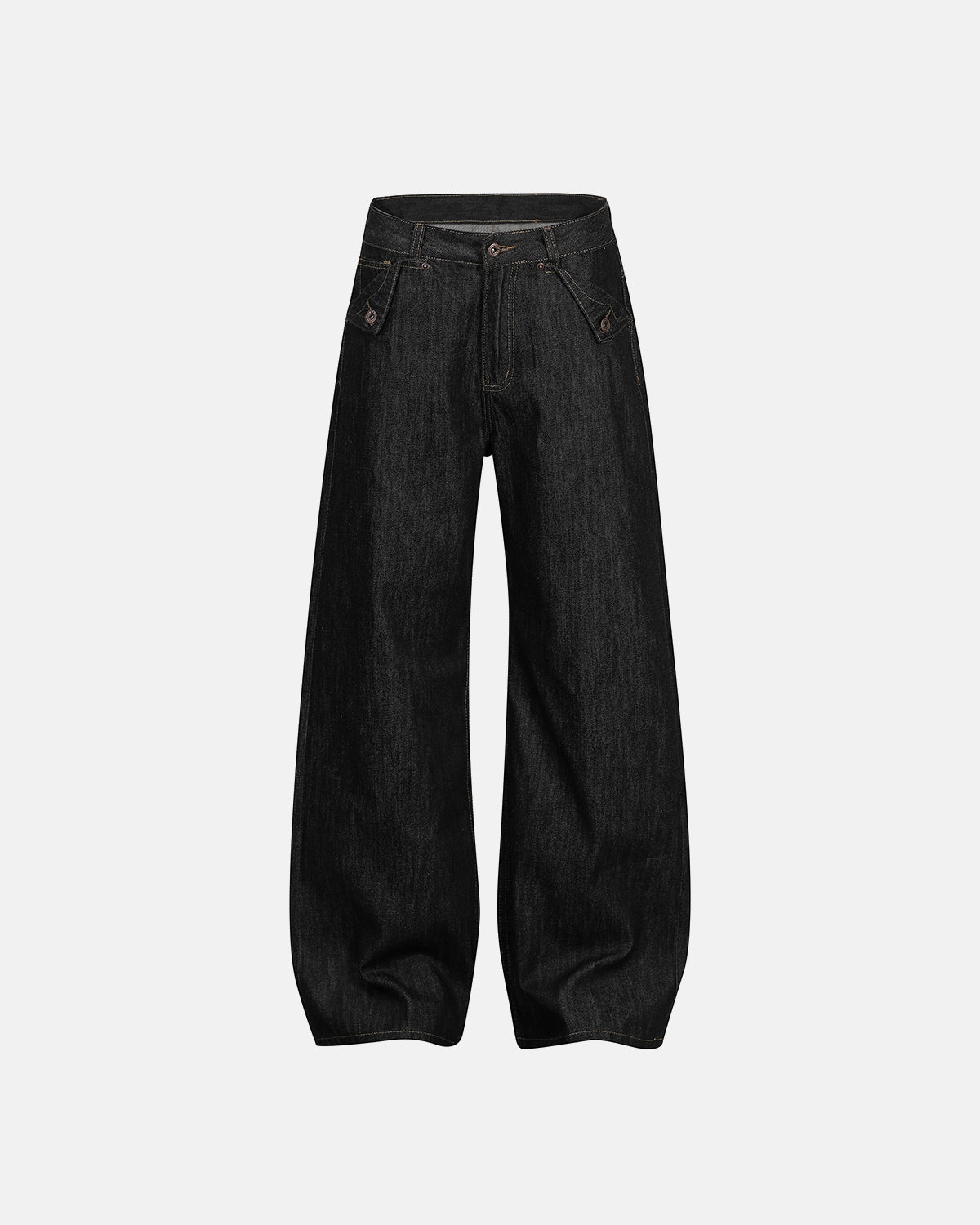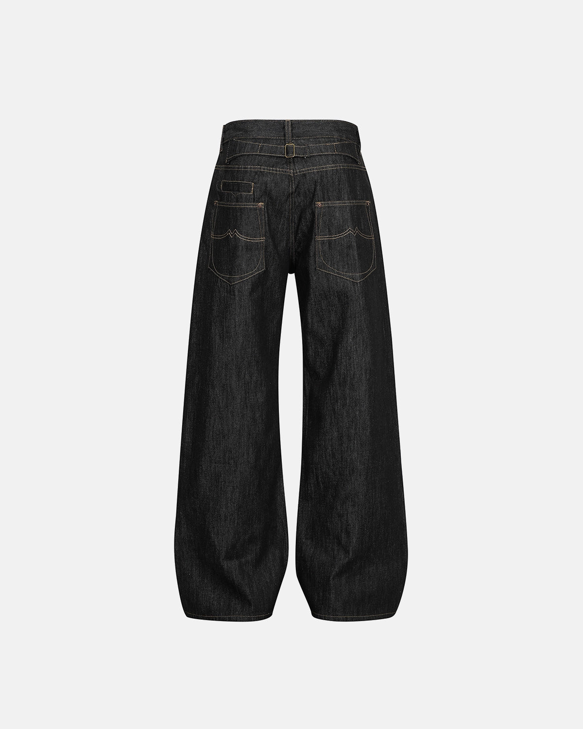 Wide-Leg Utility Jeans with cinch back, feature deep indigo raw denim with structured pocket detailing for a clean yet functional streetwear look. Designed with a relaxed wide-leg fit, this piece offers natural drape and everyday versatility. The adjustable back strap enhances fit while adding a subtle utility-inspired edge.