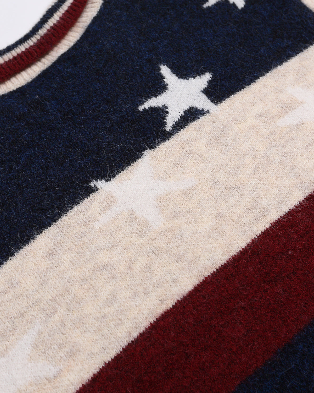 This vibrant sweater features bold colorblock stripes in red, white, and blue, with a star-studded jacquard pattern for a standout look.