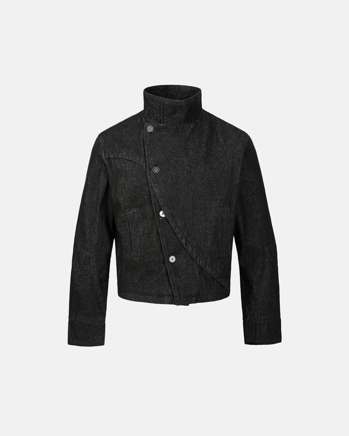 The INFLATION Cropped Asymmetric Denim Jacket brings a bold edge to modern streetwear with its structured silhouette and convertible stand collar. Crafted from premium raw denim, this cropped denim jacket features an asymmetric button-up design and clean deconstructed lines that highlight minimalist craftsmanship.