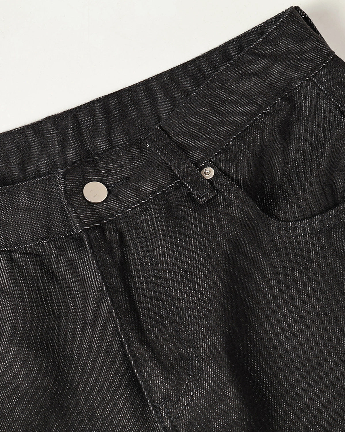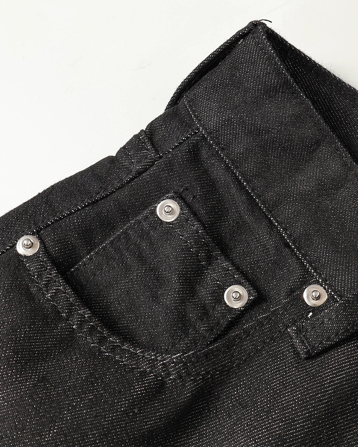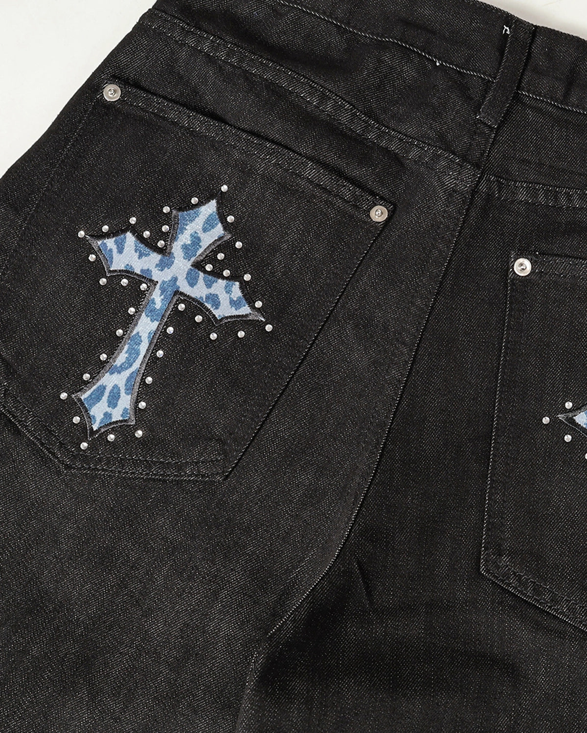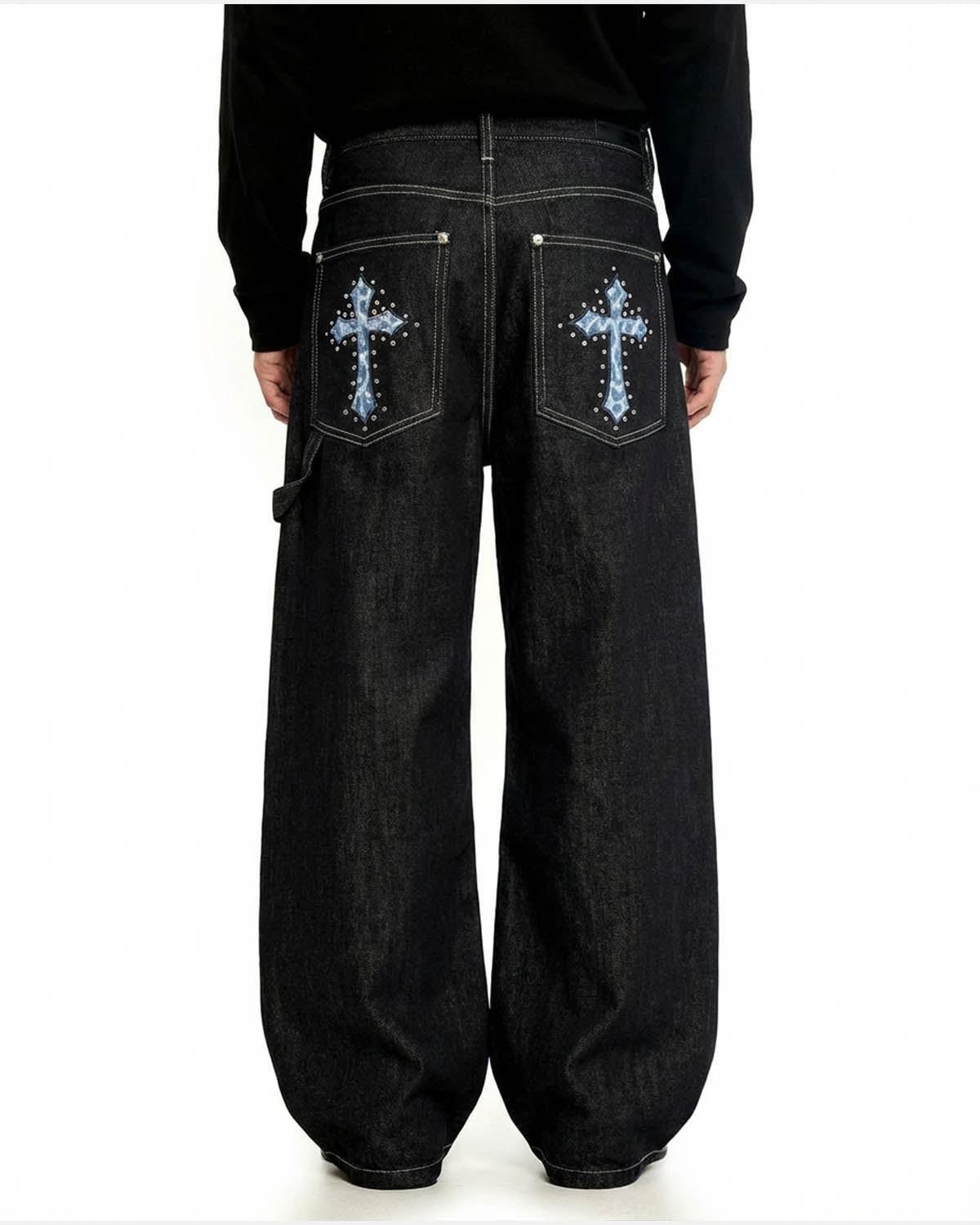Featuring embroidered cross pattern on the back pockets, finished with rhinestone detailing, and heavyweight Eco-friendly washed denim, these jeans blend edgy aesthetics with premium craftsmanship.