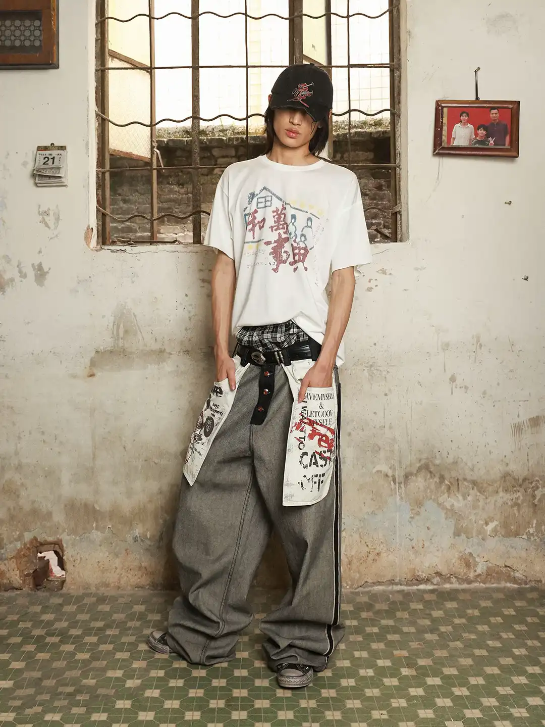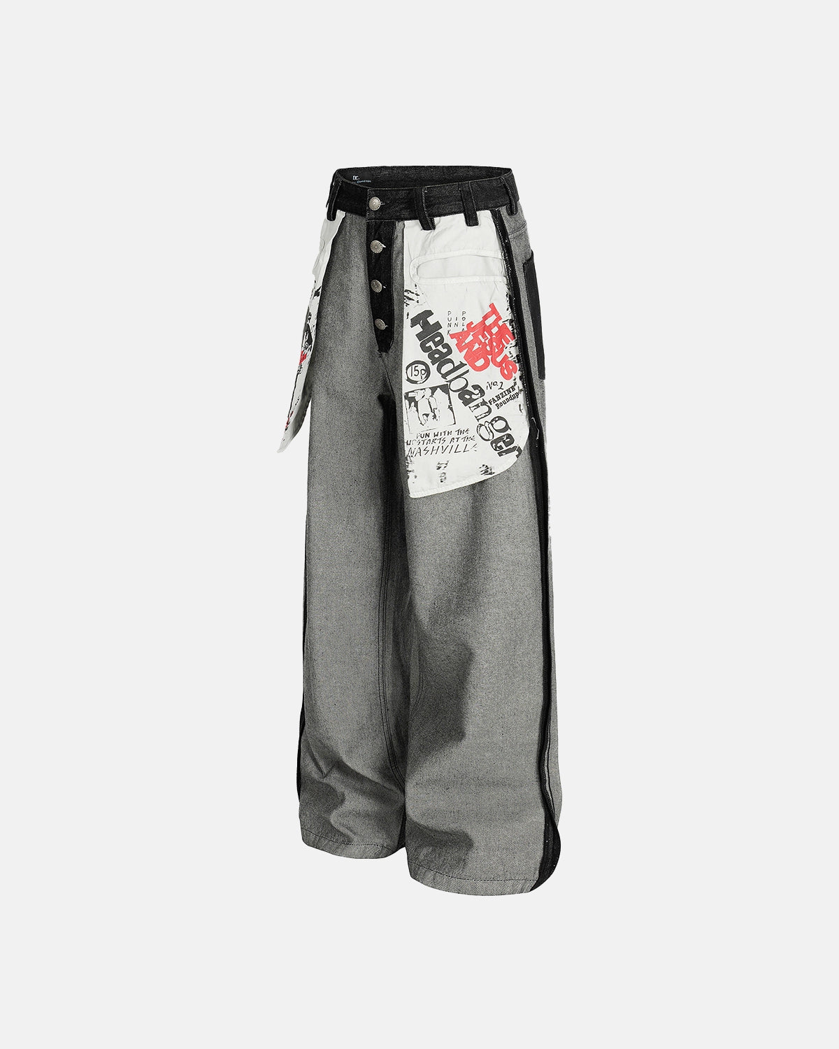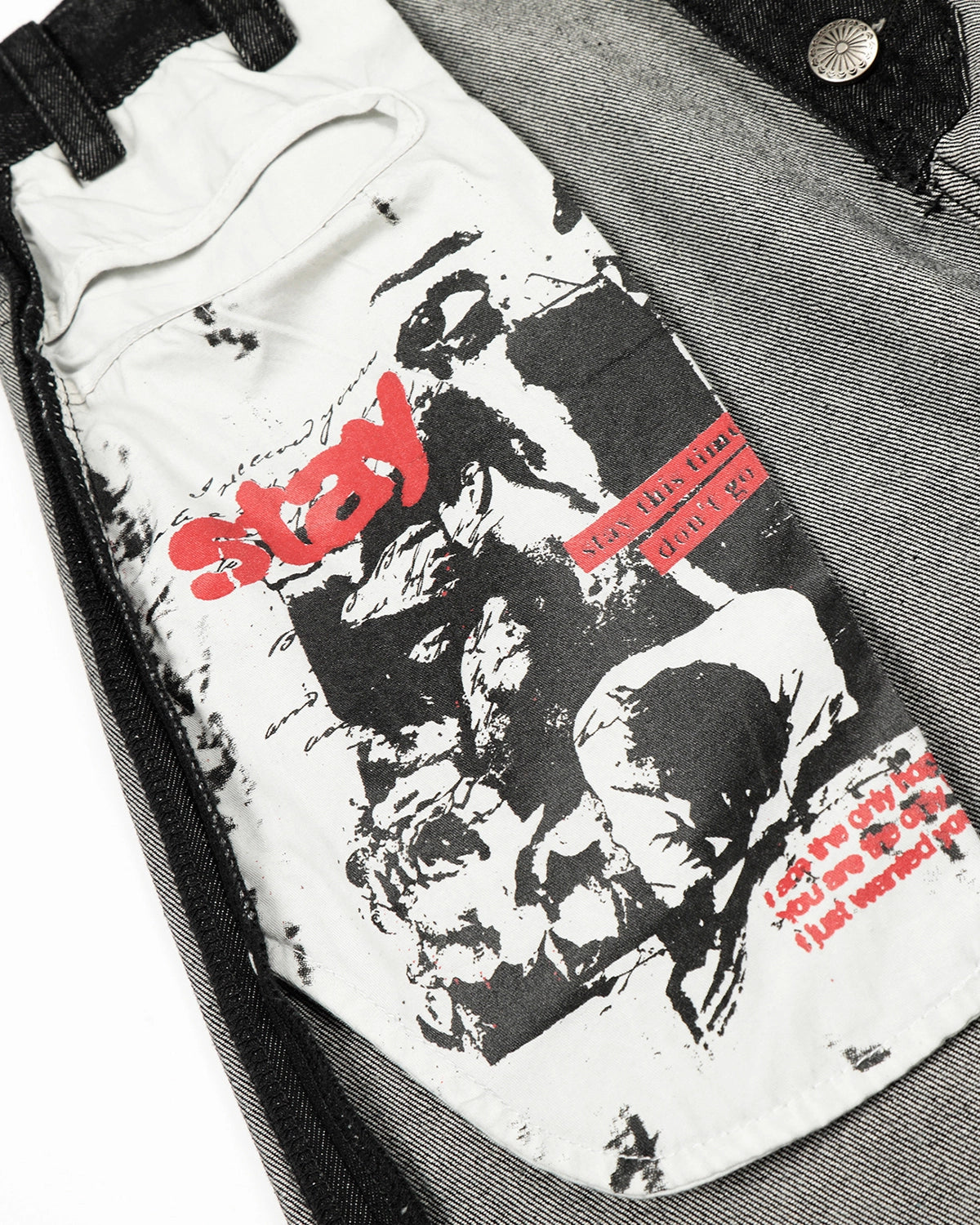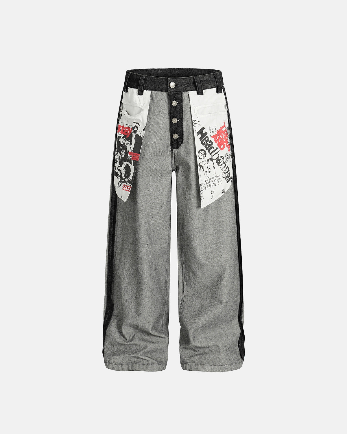 INFLATION distressed printed jeans feature a unique reverse design with oversized graphic pockets. The wide leg cut offers a relaxed fit, blending vintage edge with modern streetwear style. Designed as unisex denim, these jeans are perfect for casual outfits, urban looks, and standout high street fashion.
