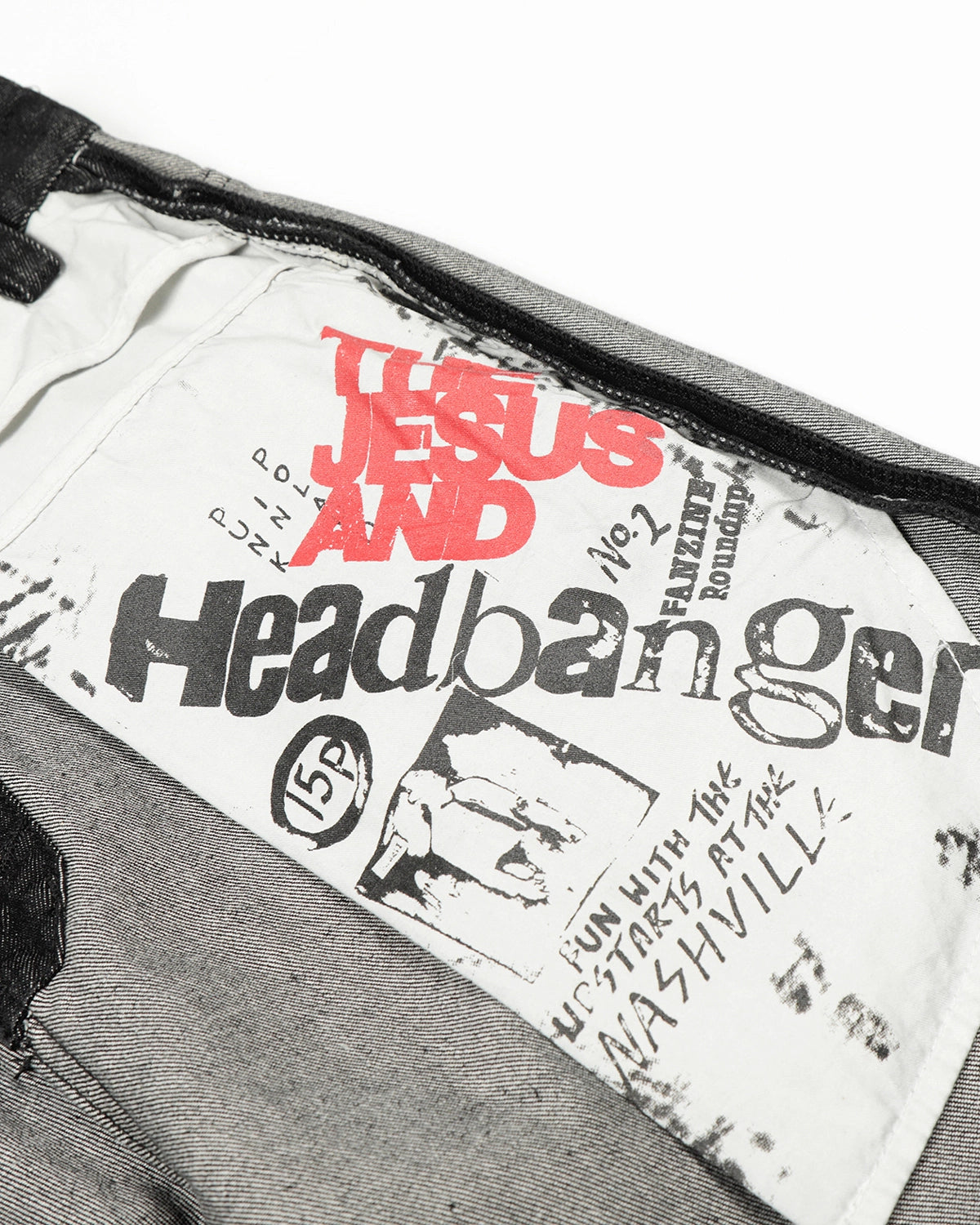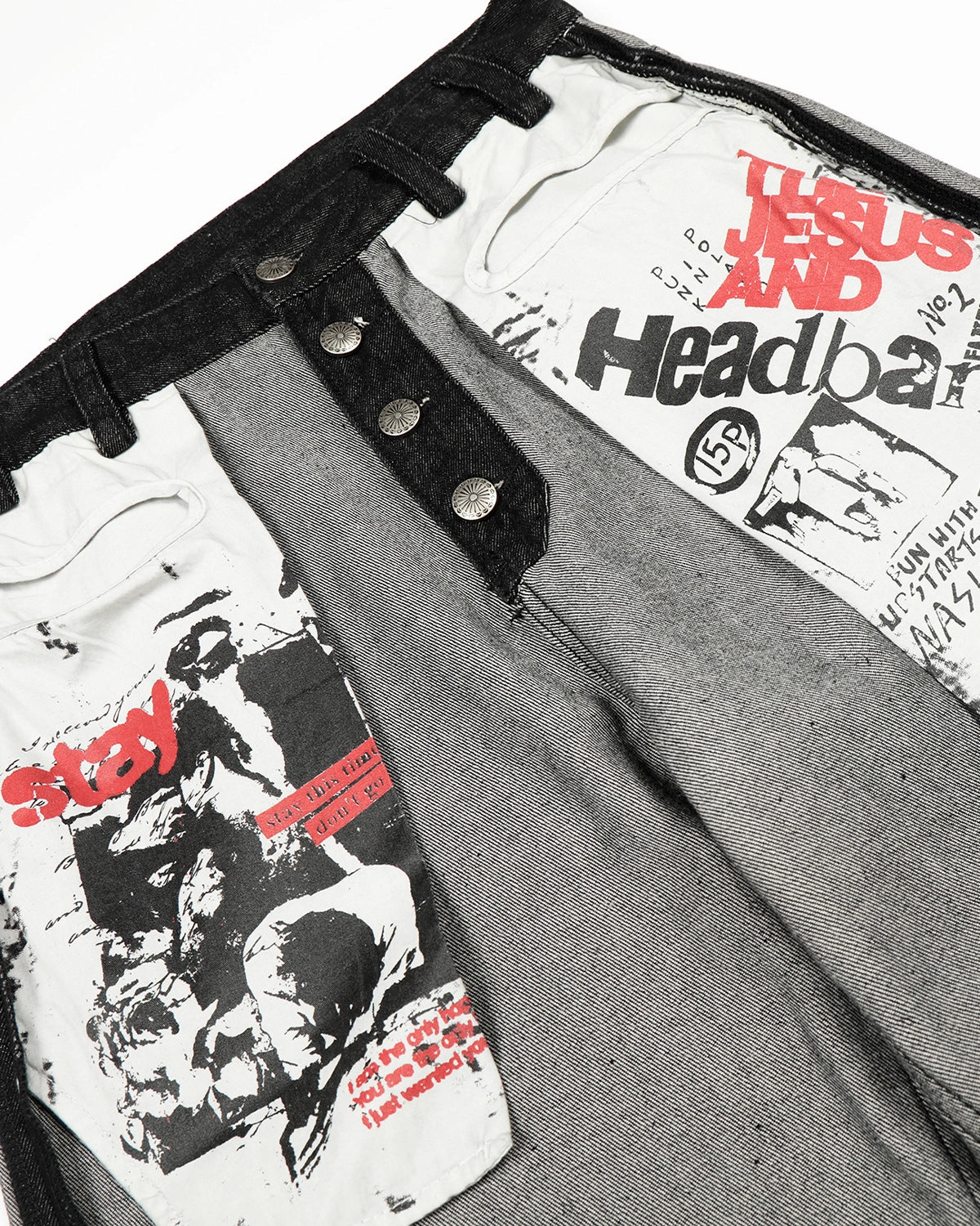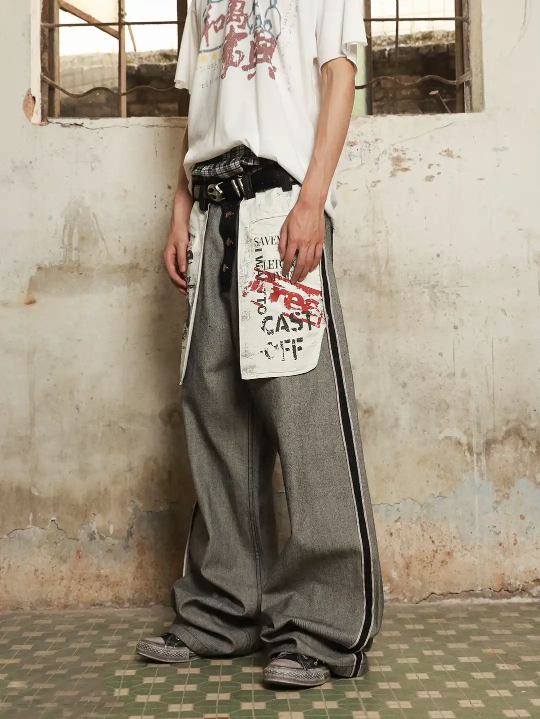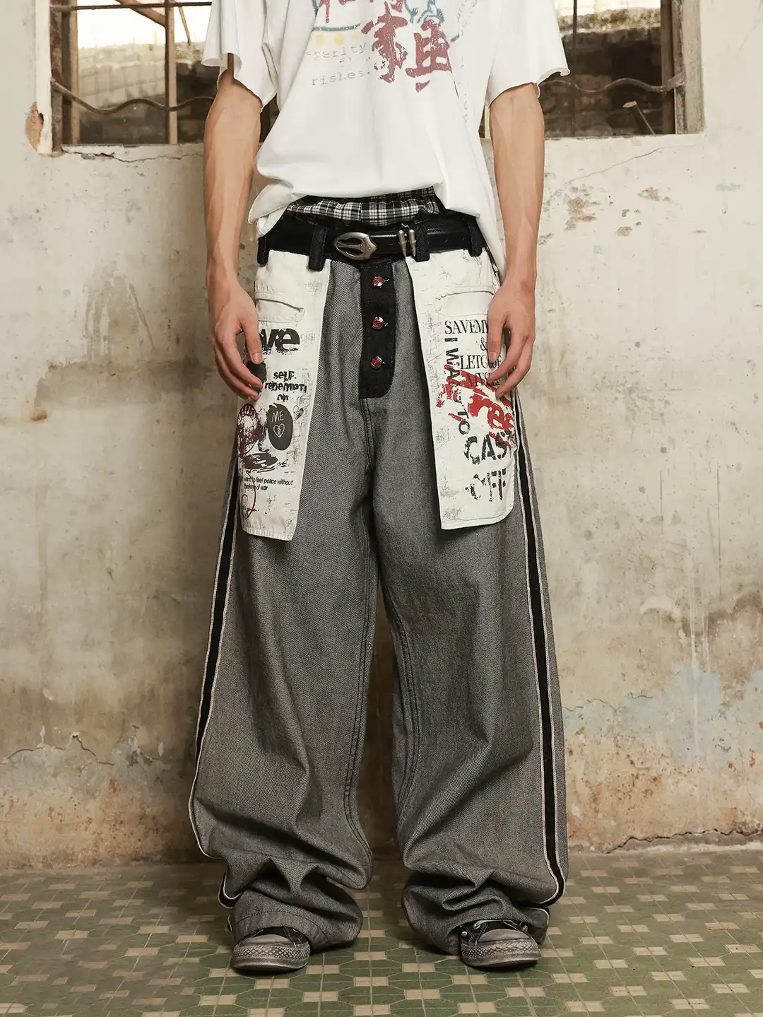 INFLATION distressed printed jeans feature a unique reverse design with oversized graphic pockets. The wide leg cut offers a relaxed fit, blending vintage edge with modern streetwear style. Designed as unisex denim, these jeans are perfect for casual outfits, urban looks, and standout high street fashion.