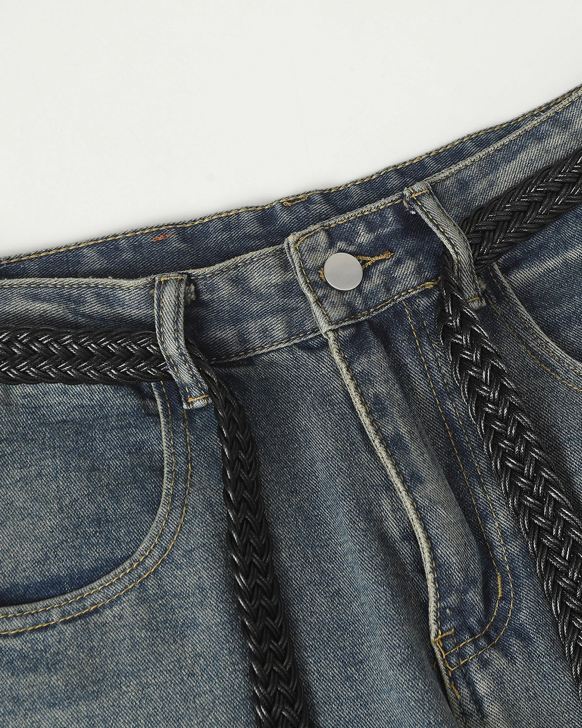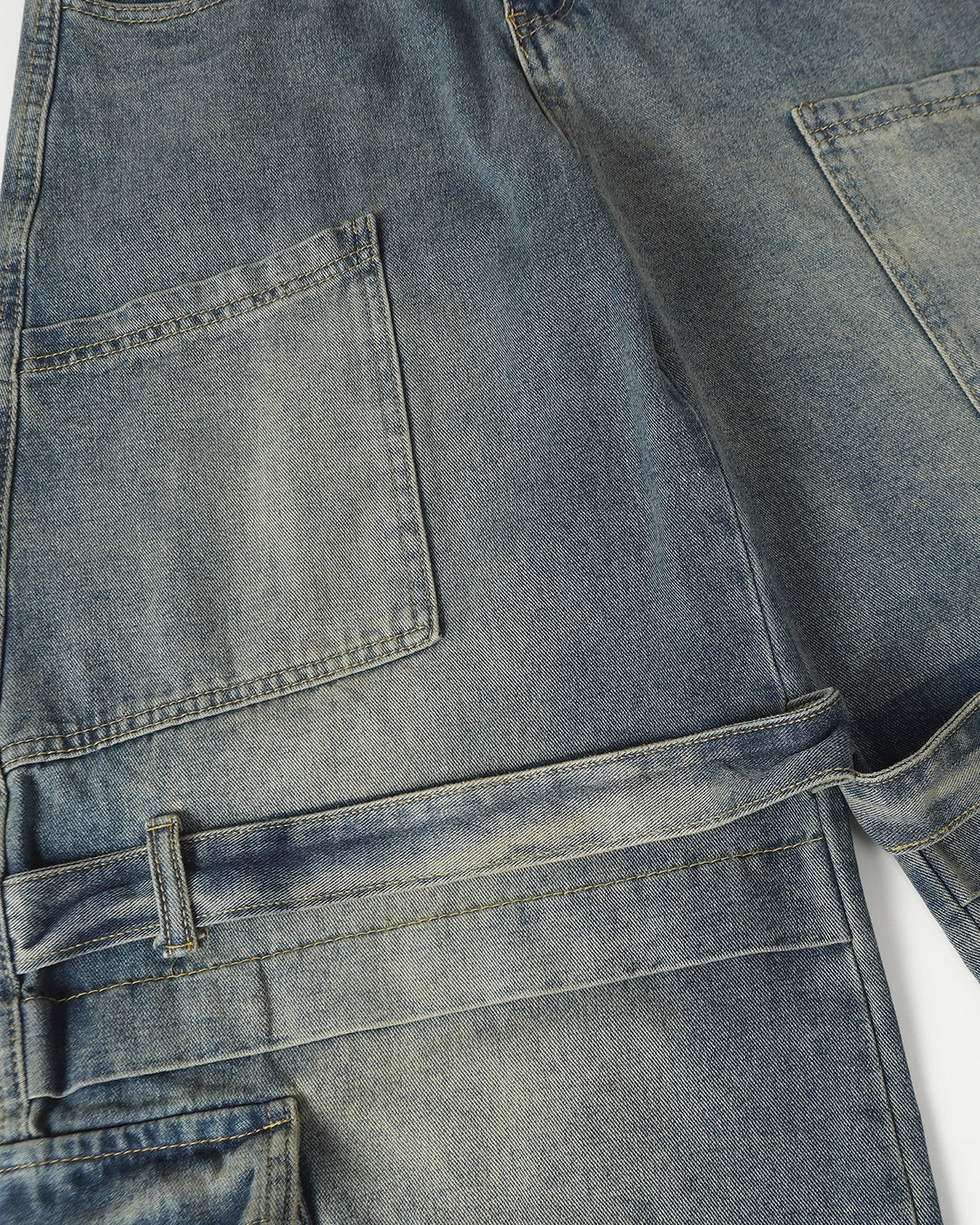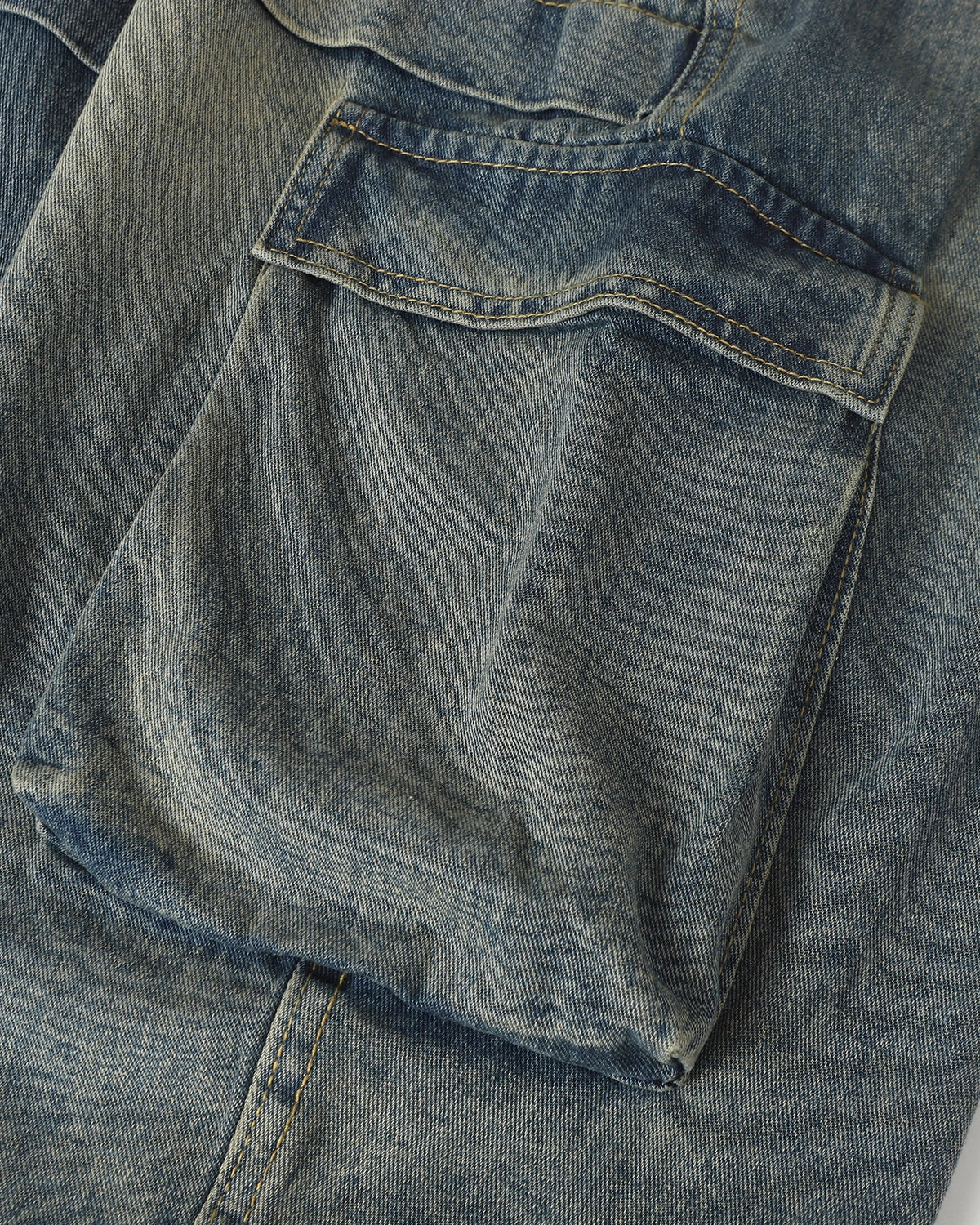 Features a washed, distressed denim surface for a worn-in, street-ready look with authentic vintage character.