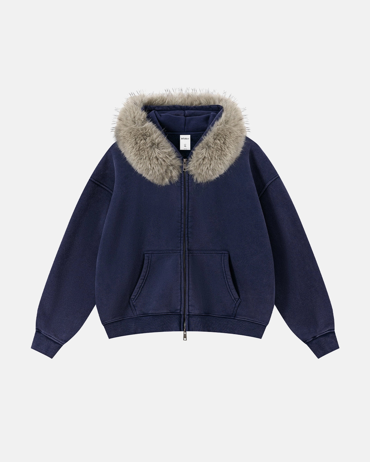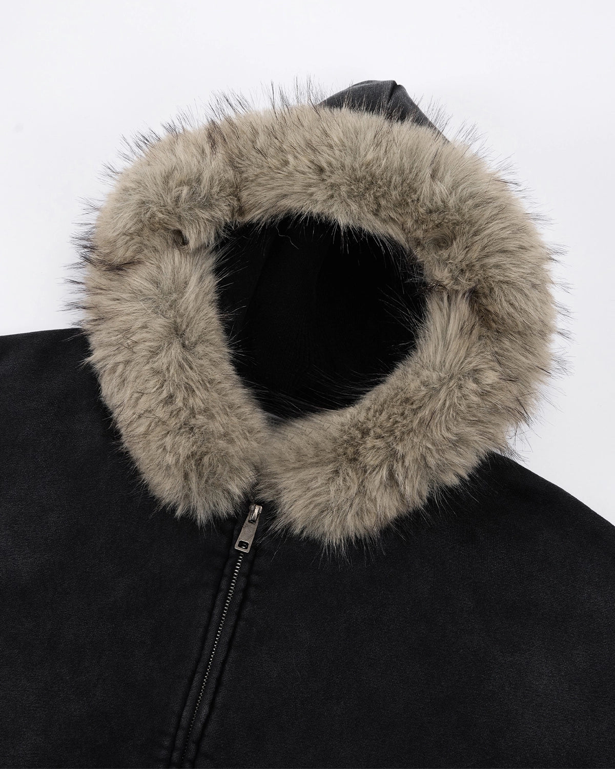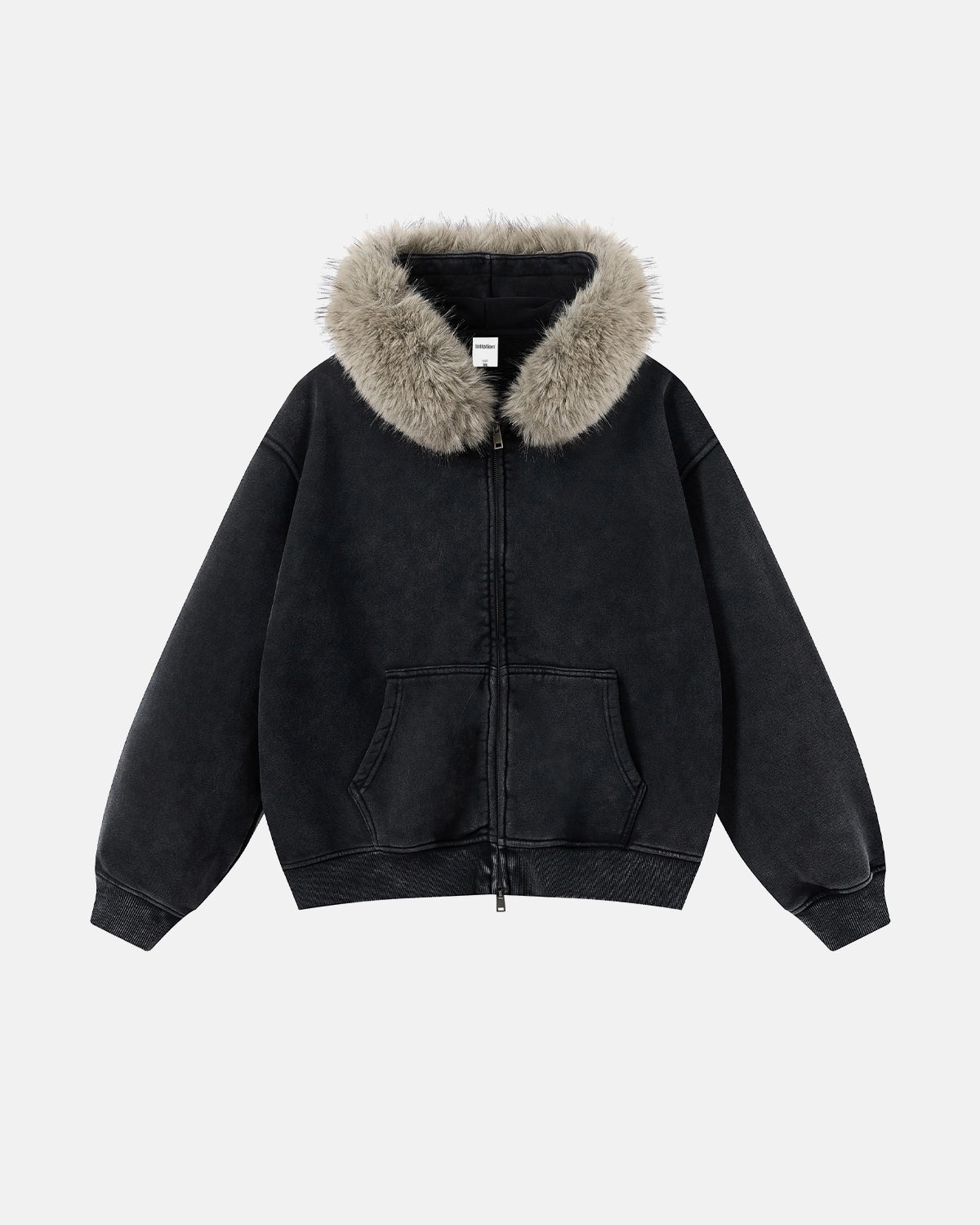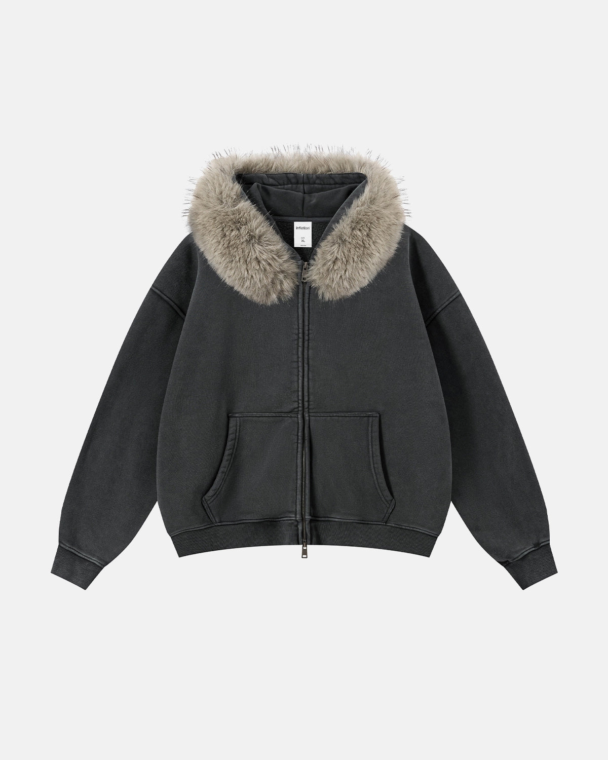 Faux Fur Collar Acid Wash Zip Up Hoodies | Inflation Streetwear