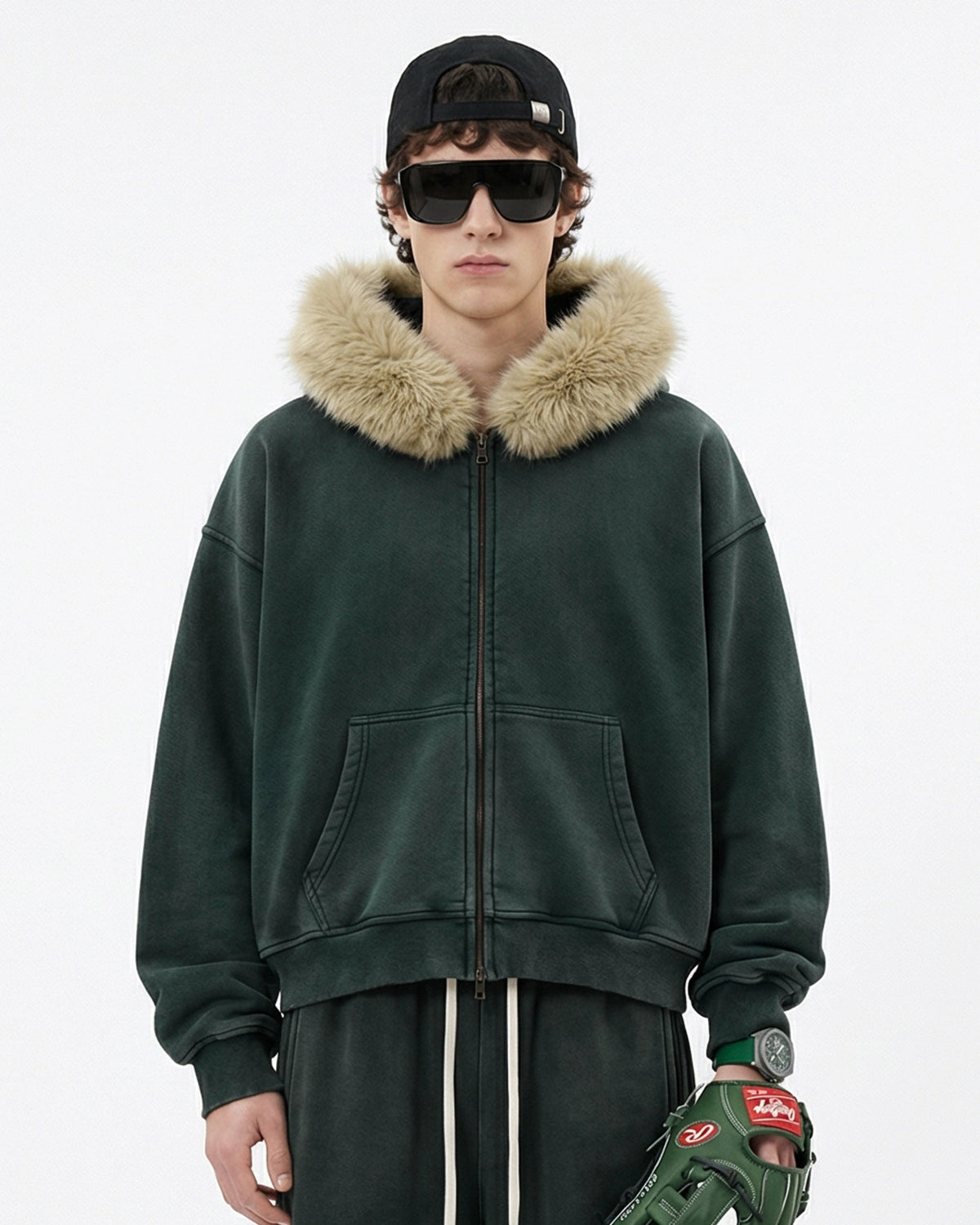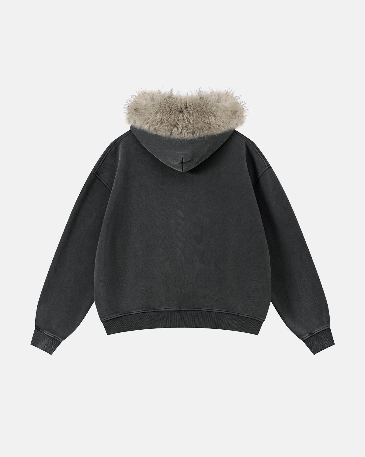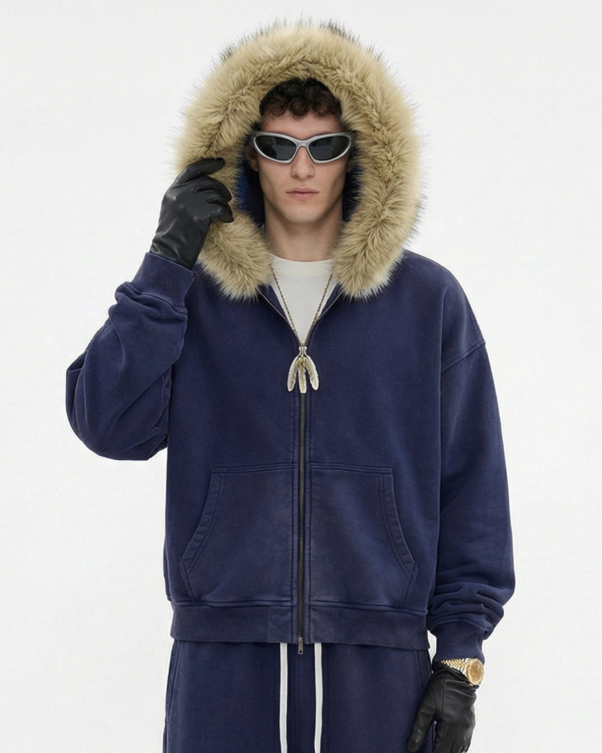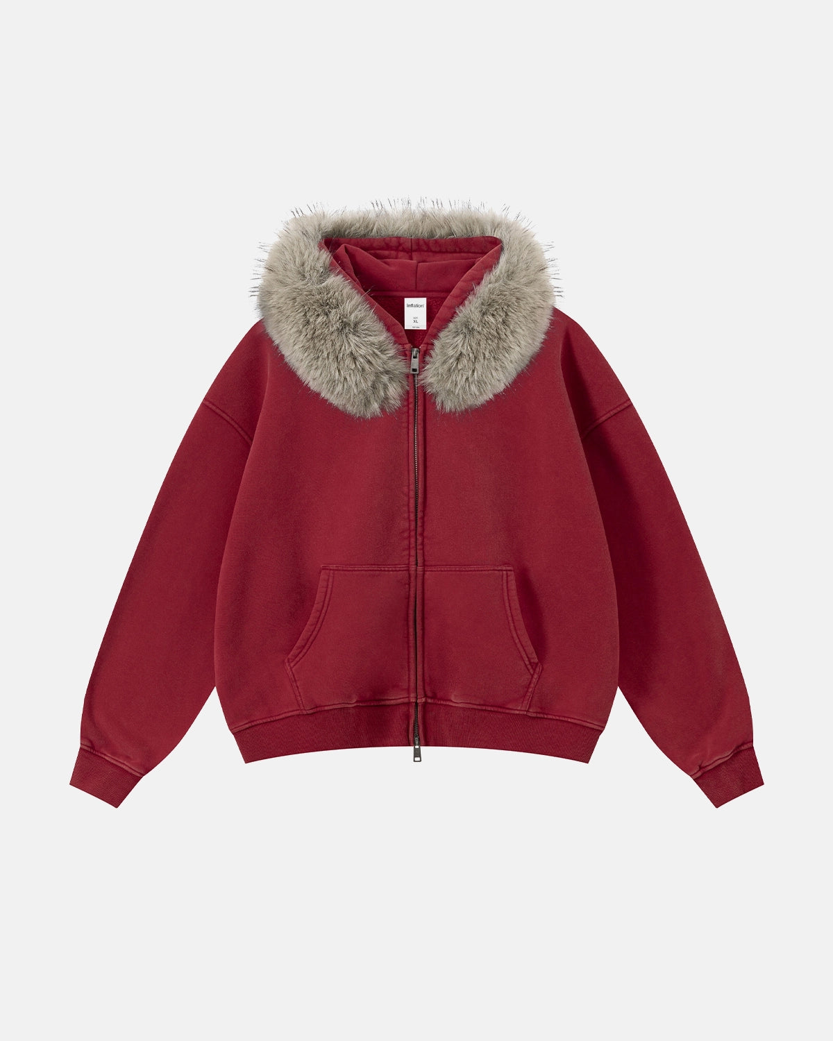 Faux Fur Collar Acid Wash Zip Up Hoodies | Inflation Streetwear