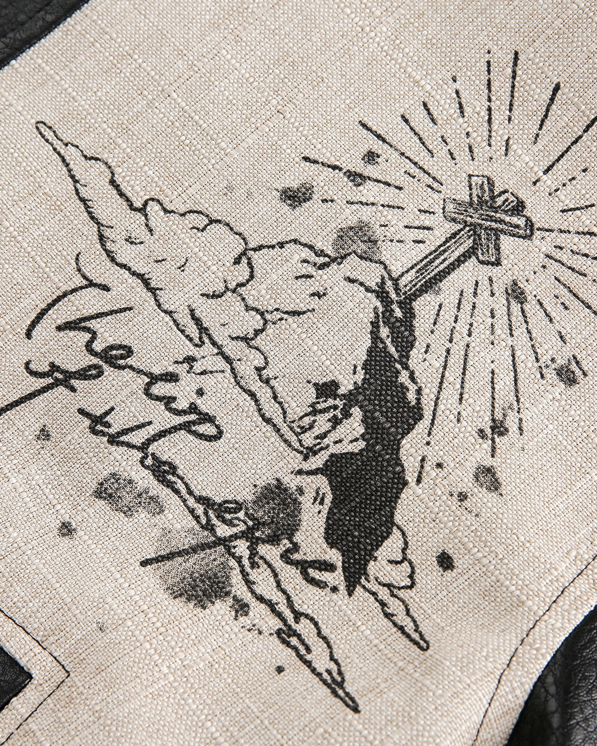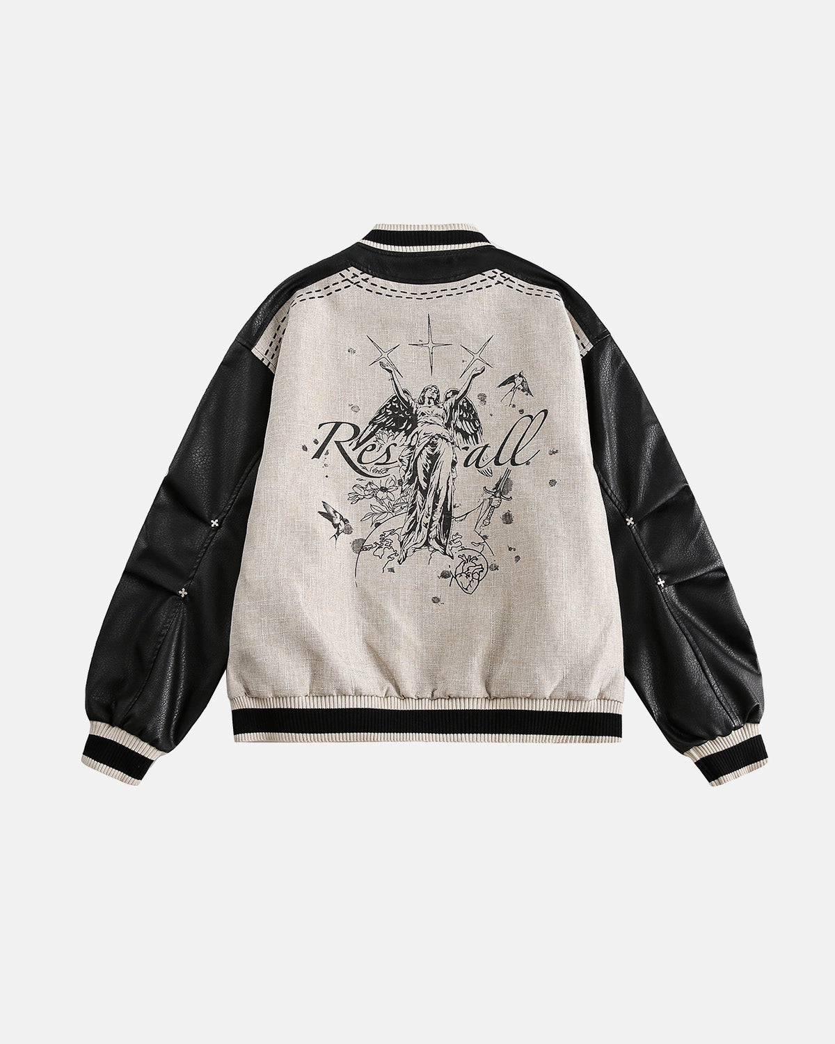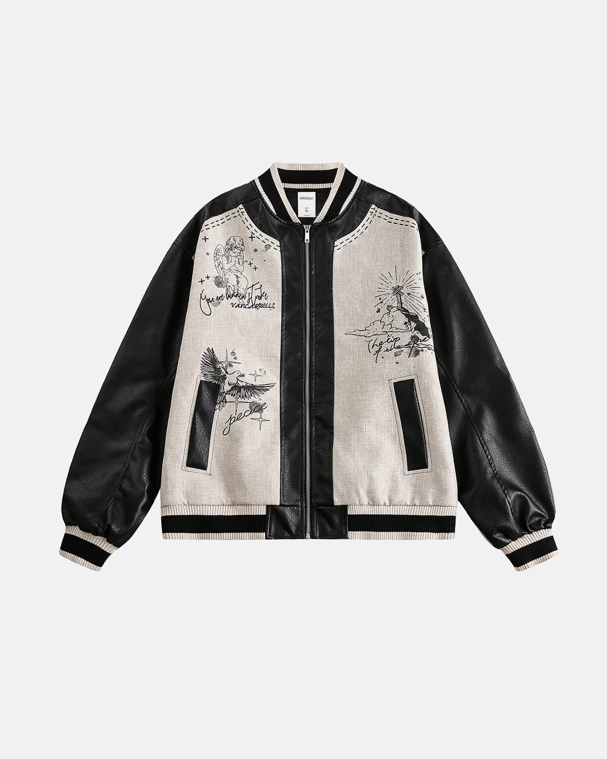 Stand out in street style with the Vintage Design PU Sleeve Bomber Jacket from Inflation Streetwear. Featuring bold embroidered graphics on a mix of canvas and PU leather sleeves, this jacket embodies a unique blend of American vintage and modern streetwear aesthetics. The angelic and symbolic embroidery on the front and back adds an edgy touch, while the bomber jacket silhouette ensures a relaxed, comfortable fit. Ideal for layering over tees or hoodies, it provides warmth with a stylish flair.