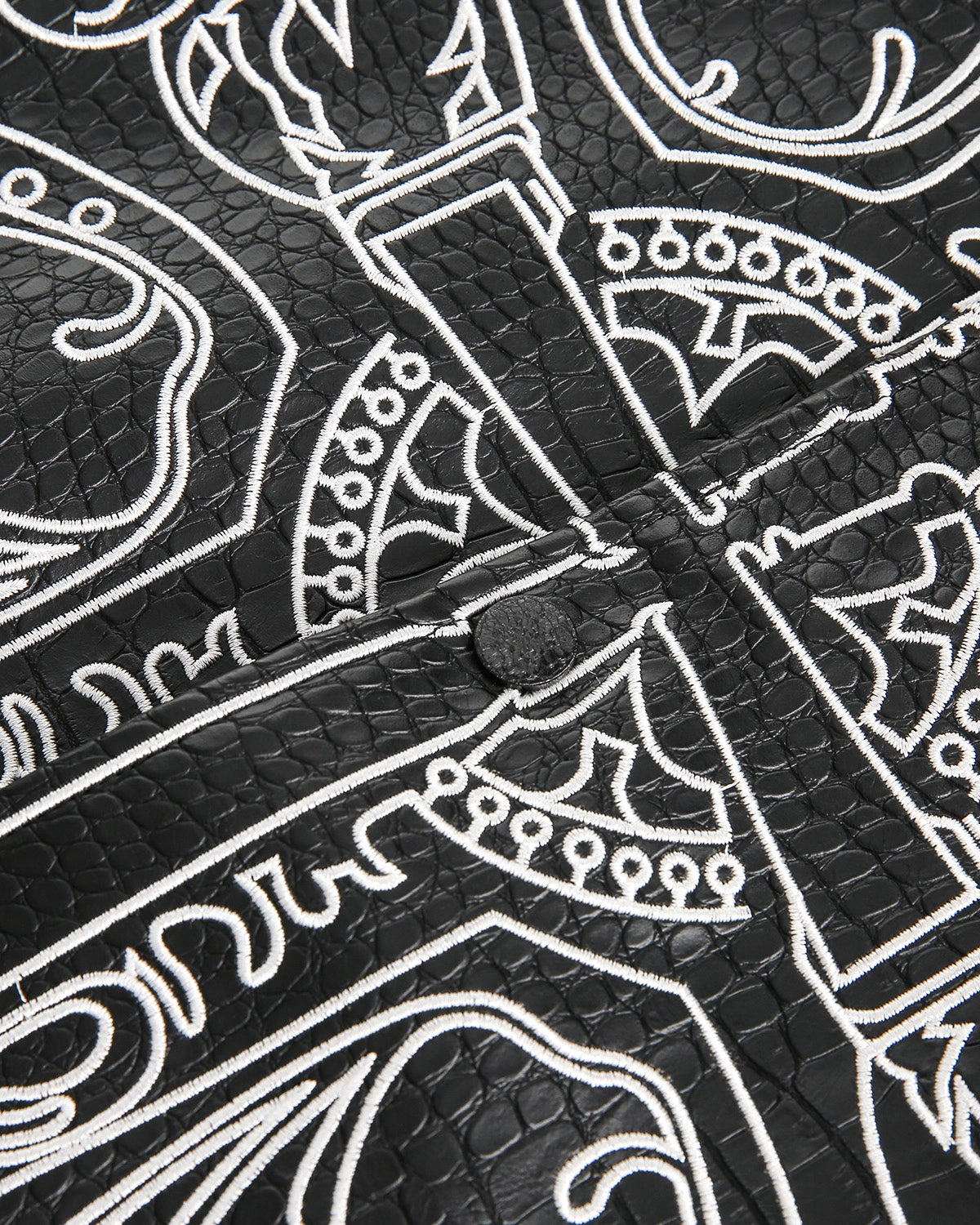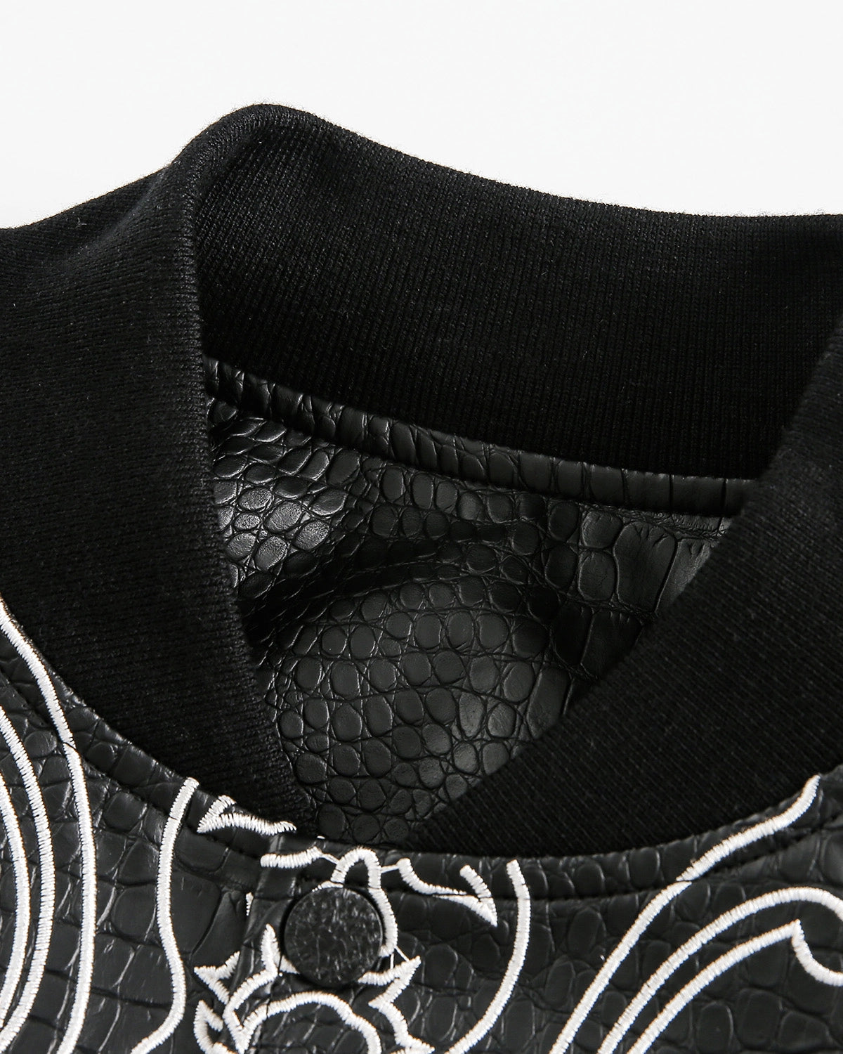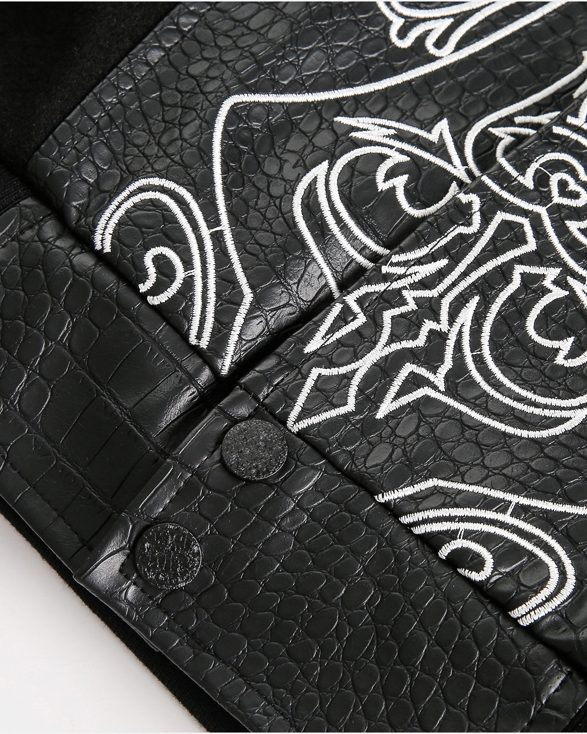 Step up your streetwear game with the Crocodile PU Leather Cross Embroidery Bomber Jacket from Inflation Streetwear. This edgy jacket features a bold, high-street inspired design, combining intricate cross embroidery with crocodile-pattern PU leather for a luxurious yet tough look. The color-blocked sleeves and ribbed cuffs give it a contemporary twist, while the comfortable bomber silhouette ensures a relaxed fit.