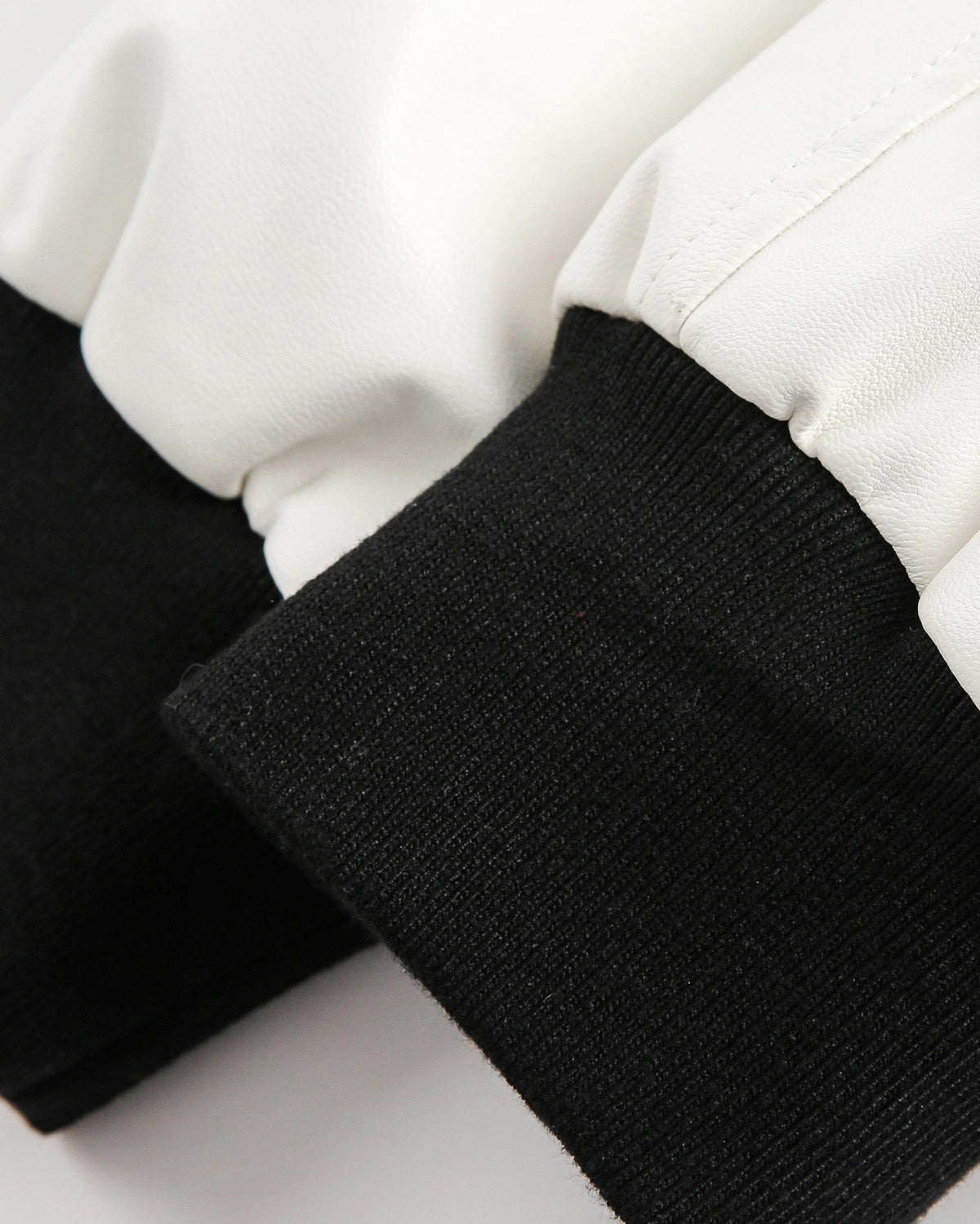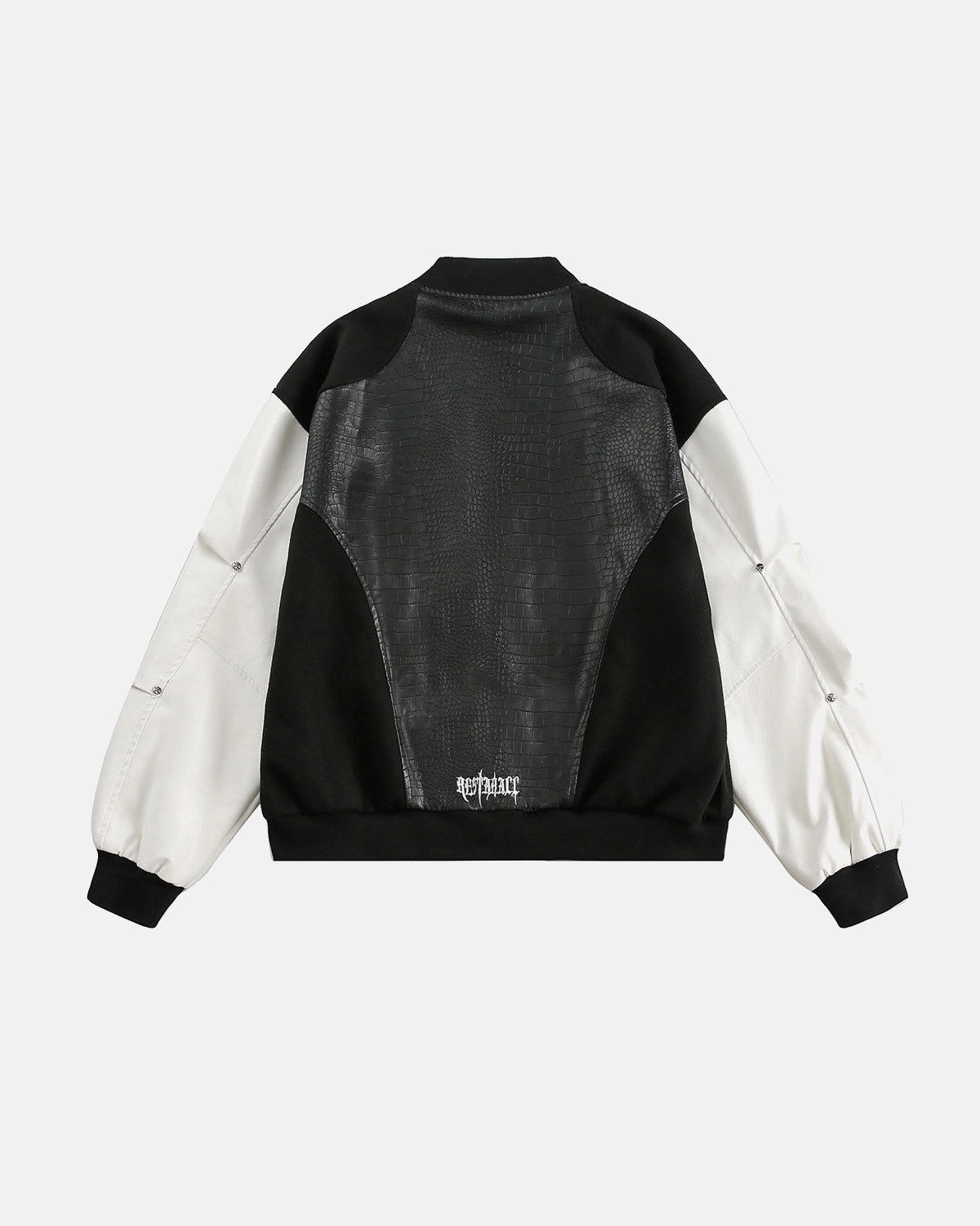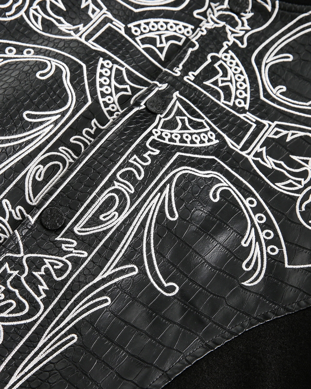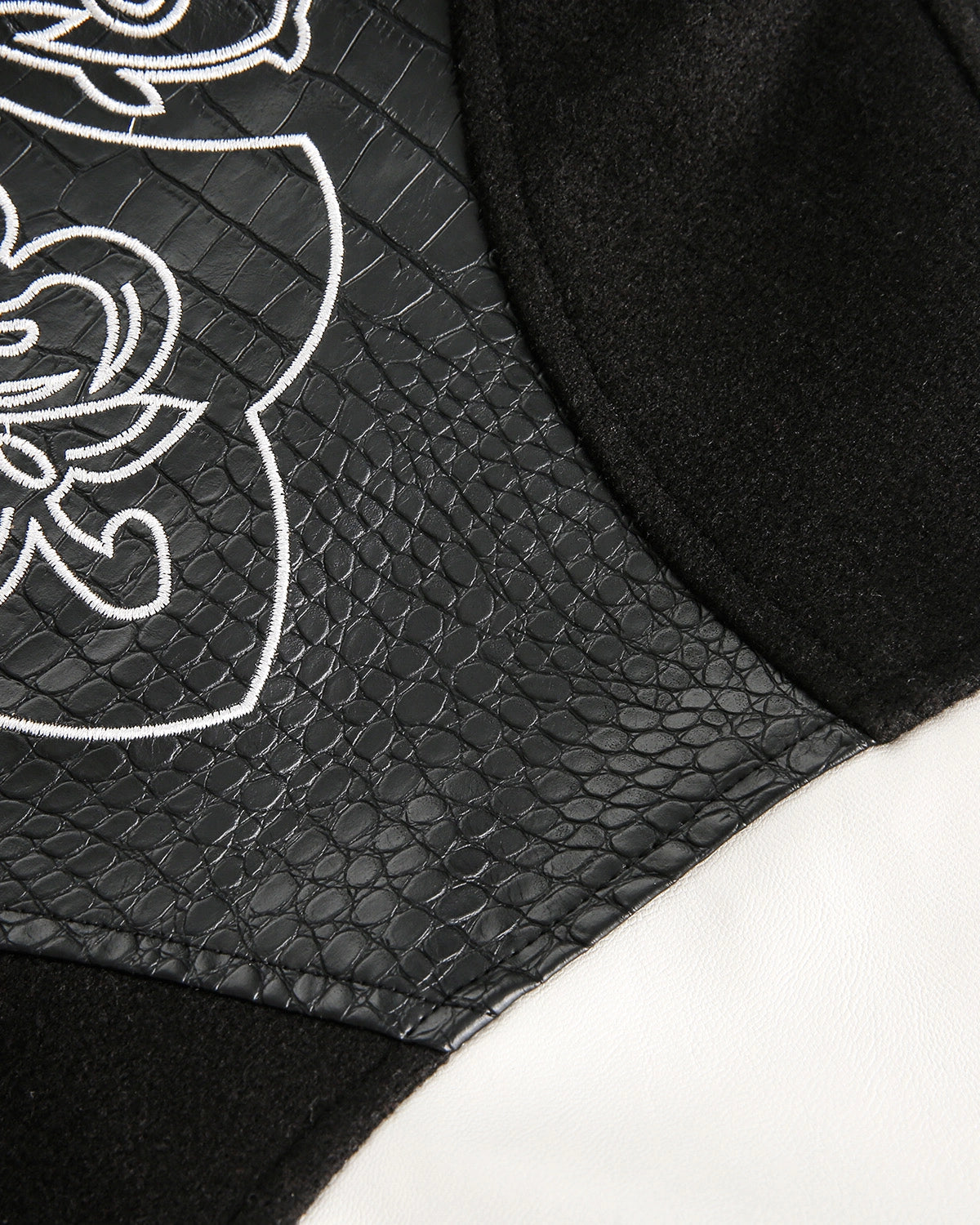 Step up your streetwear game with the Crocodile PU Leather Cross Embroidery Bomber Jacket from Inflation Streetwear. This edgy jacket features a bold, high-street inspired design, combining intricate cross embroidery with crocodile-pattern PU leather for a luxurious yet tough look. The color-blocked sleeves and ribbed cuffs give it a contemporary twist, while the comfortable bomber silhouette ensures a relaxed fit.