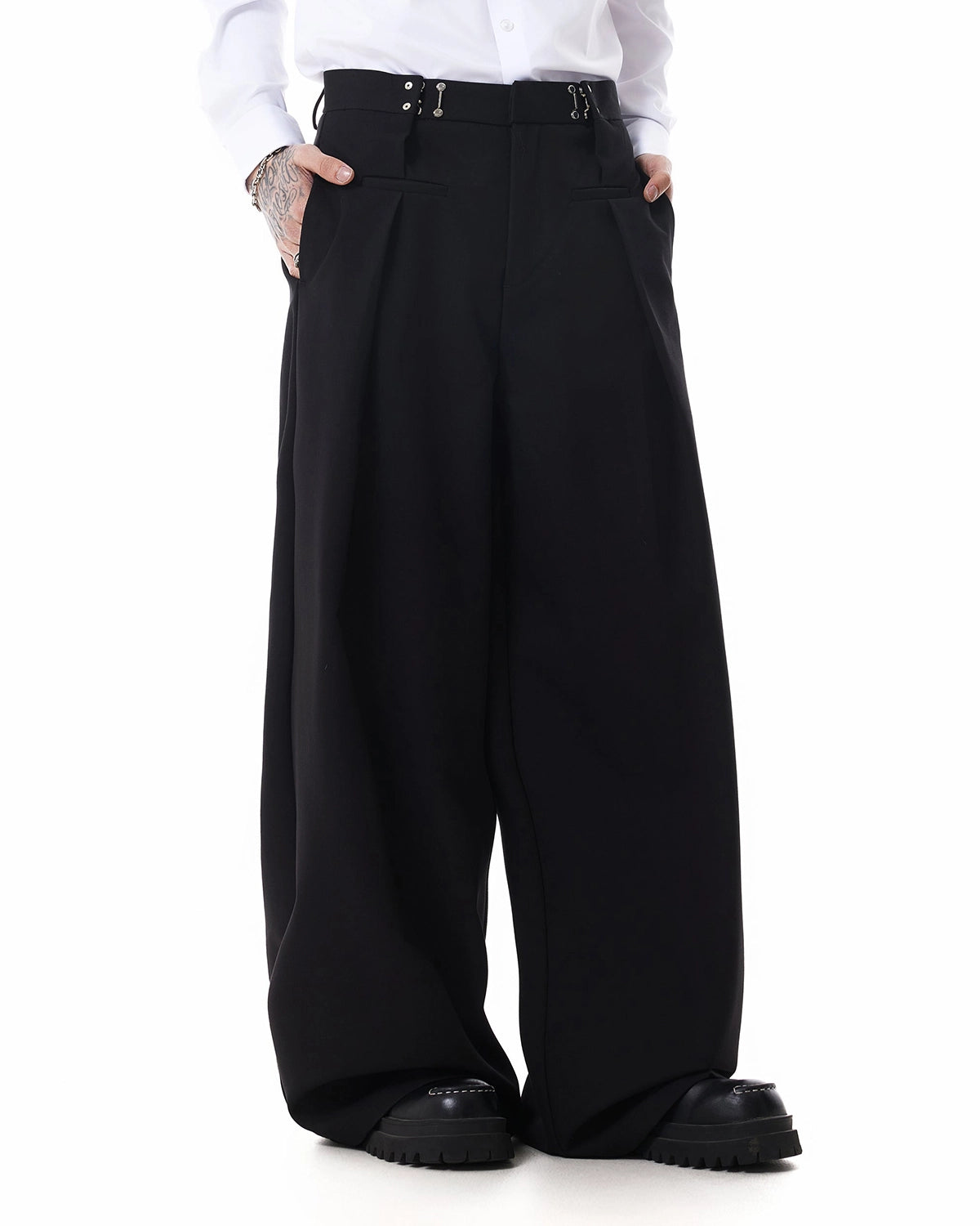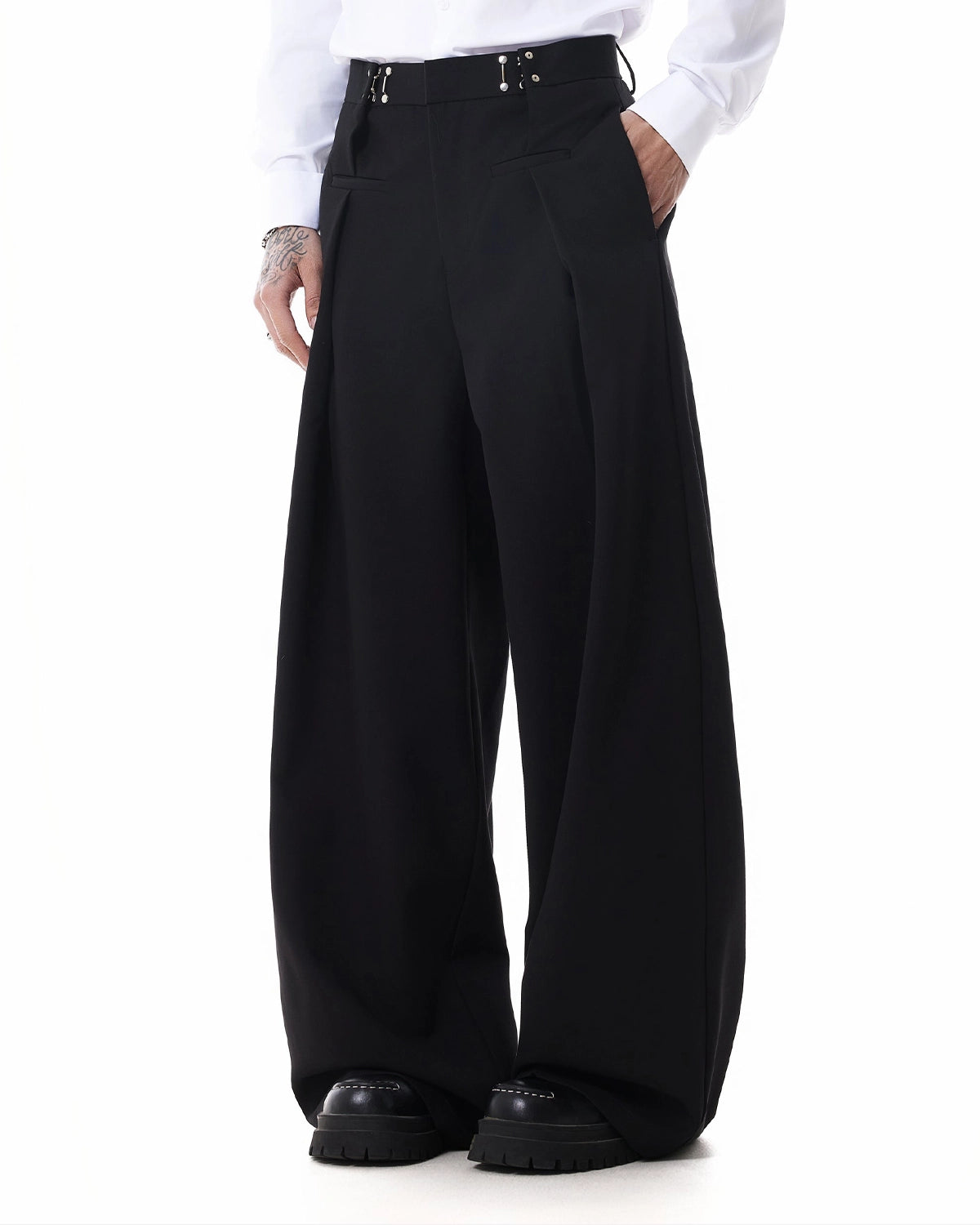 The Inflation Metal Hook Wide-Leg Tailored Pants redefine modern street tailoring with a sharp, elevated silhouette. Crafted from structured, premium fabric, these pants feature a clean wide-leg cut that drapes effortlessly while maintaining a strong architectural shape.
