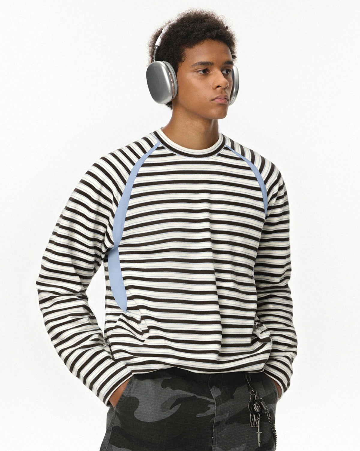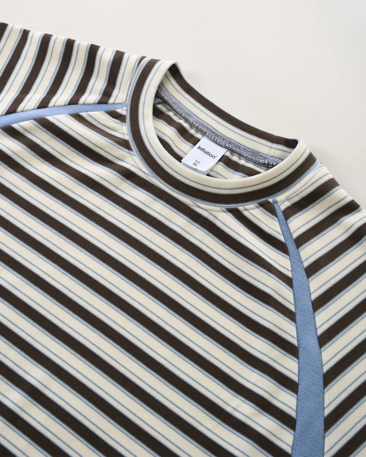 The Retro Oversized Striped T-shirt from INFLATION Streetwear blends vintage style with modern comfort. Crafted from premium knitted fleece fabric, this t-shirt features bold black, white, and brown stripes for a timeless retro vibe. The unique contrast material panels on the shoulders and underarms add depth and create a dynamic layered look, making it stand out in any wardrobe. With its classic crew neck and oversized fit, this long-sleeve shirt is perfect for casual streetwear looks or layering for a more stylish and versatile appearance.