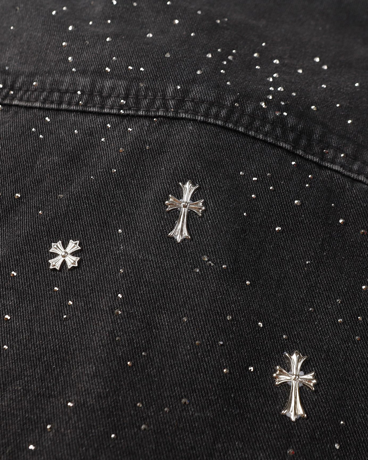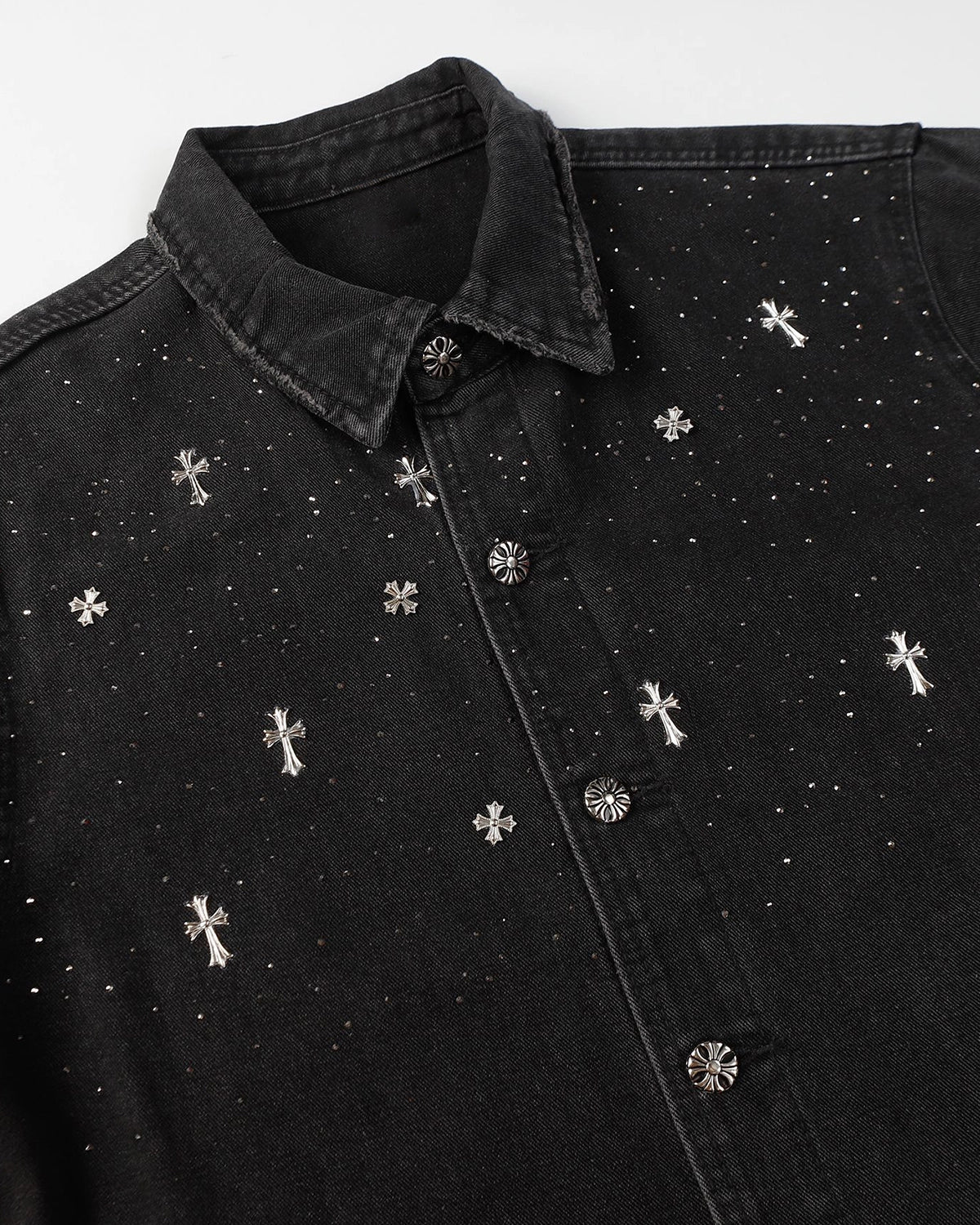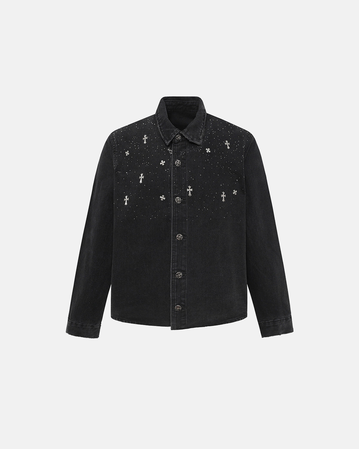 Starry Cross Rhinestone Washed Denim Shirt | Inflation Streetwear