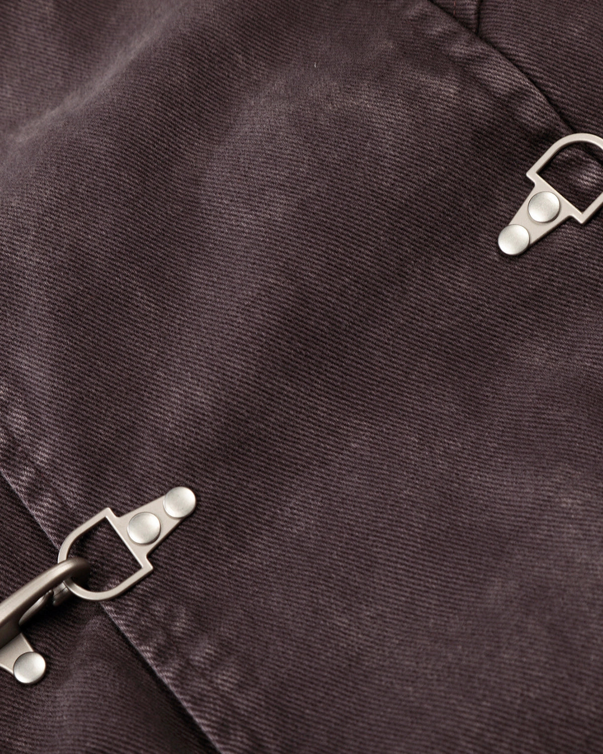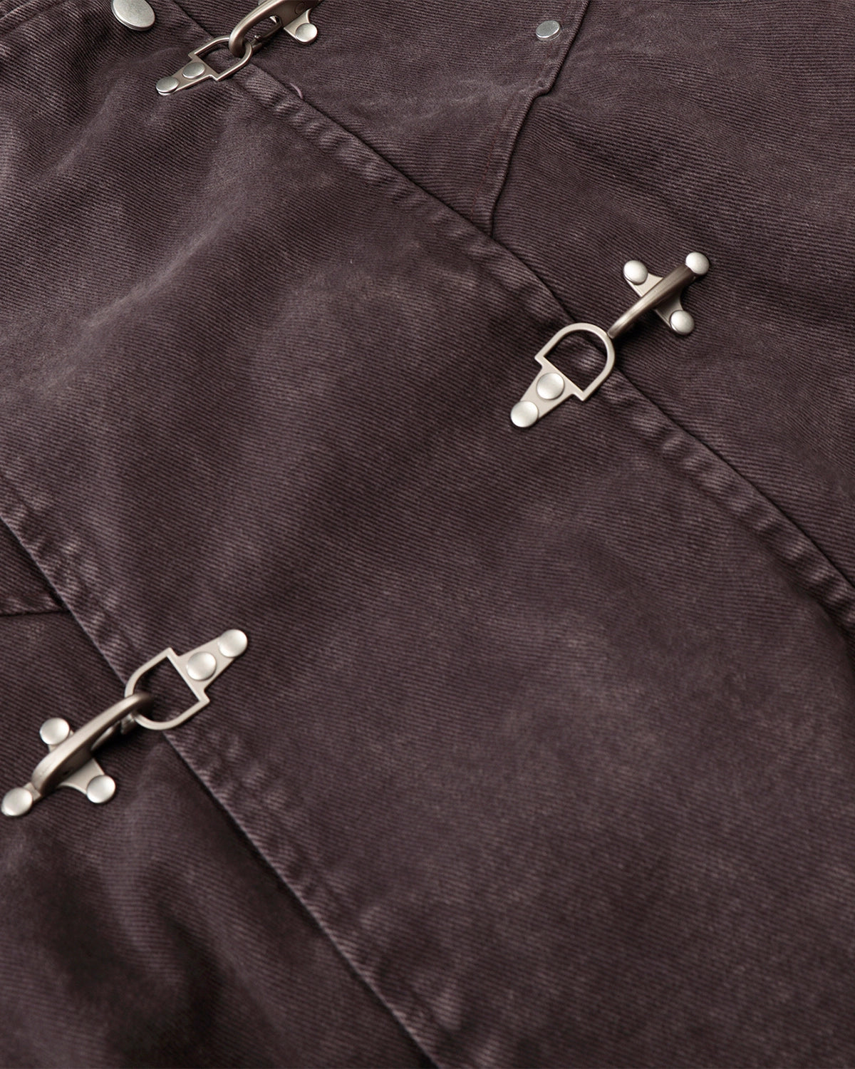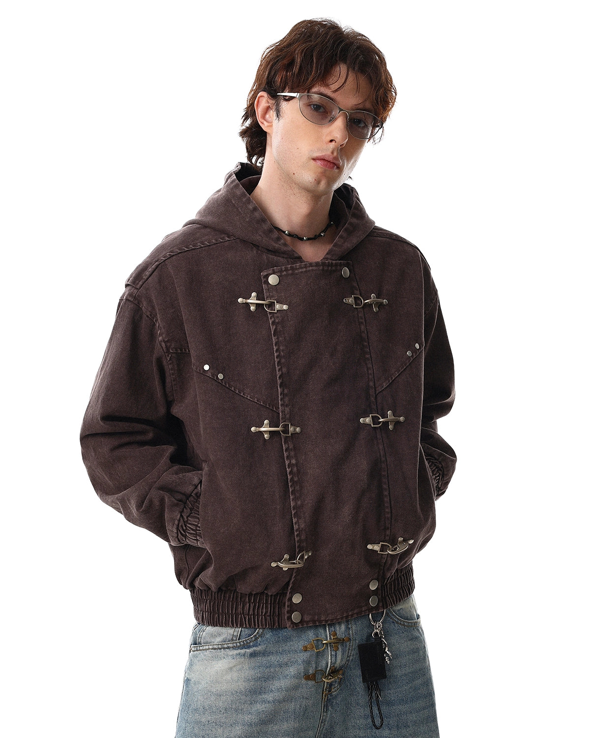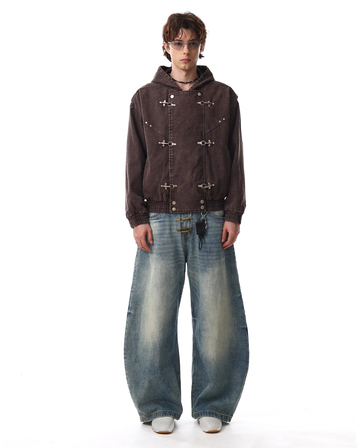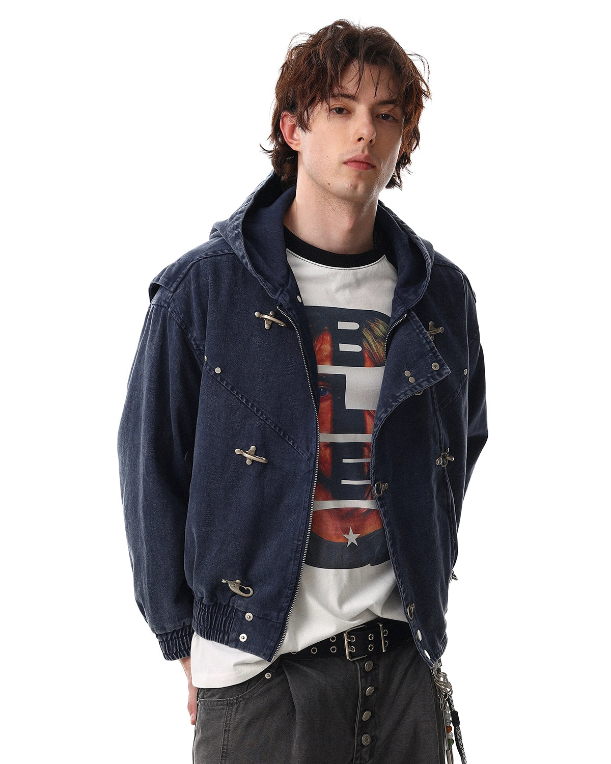 Crafted from vintage washed denim, this jacket features distinctive fireman-style metal clasp closures, delivering a bold industrial edge. The hooded design adds versatility and layering appeal, while the cropped, relaxed fit creates a sharp street-ready silhouette.