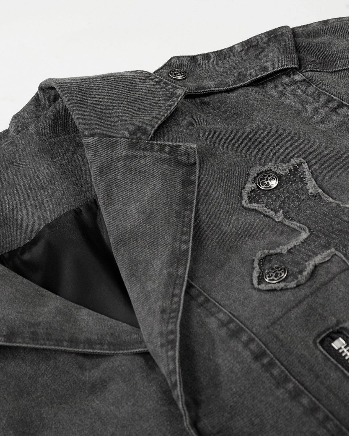 Crafted with a vintage washed finish, this lapel jacket features quilted applique detailing with a metal cross accent, delivering strong visual impact and refined texture.
